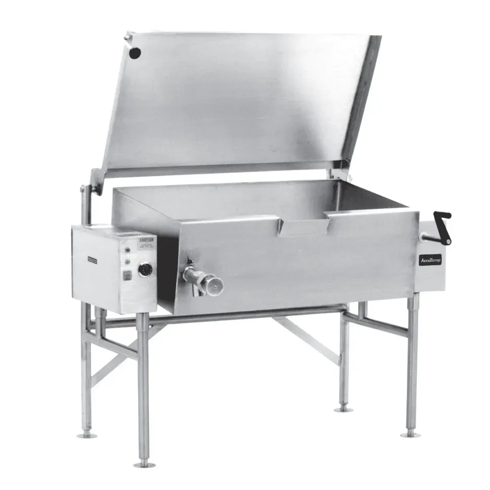 Master the Art of Cuisine with the AccuTemp ALTES-30 Tilting Skillet Braising Pan. This electric skillet is designed to meet the demands of a commercial restaurant kitchen, offering a 30-gallon capacity and thermostatically controlled heating elements. The field replaceable heating elements ensure easy maintenance and longevity, while the self-locking worm gear and tilt mechanism provide effortless operation. The heavy-duty actuator-assisted cover comes with a condensate drip shield and cover vent, keeping your dishes moist and flavorful. The 304 stainless steel and clad pan body construction ensures durability and easy cleaning. The open 1-5/8 tubular leg stand provides stability and allows for easy access during cooking. With UL and NSF certifications, you can trust the AccuTemp ALTES-30 for safe and reliable performance in your commercial kitchen. Elevate your culinary creations with this versatile and efficient tilting skillet braising pan.