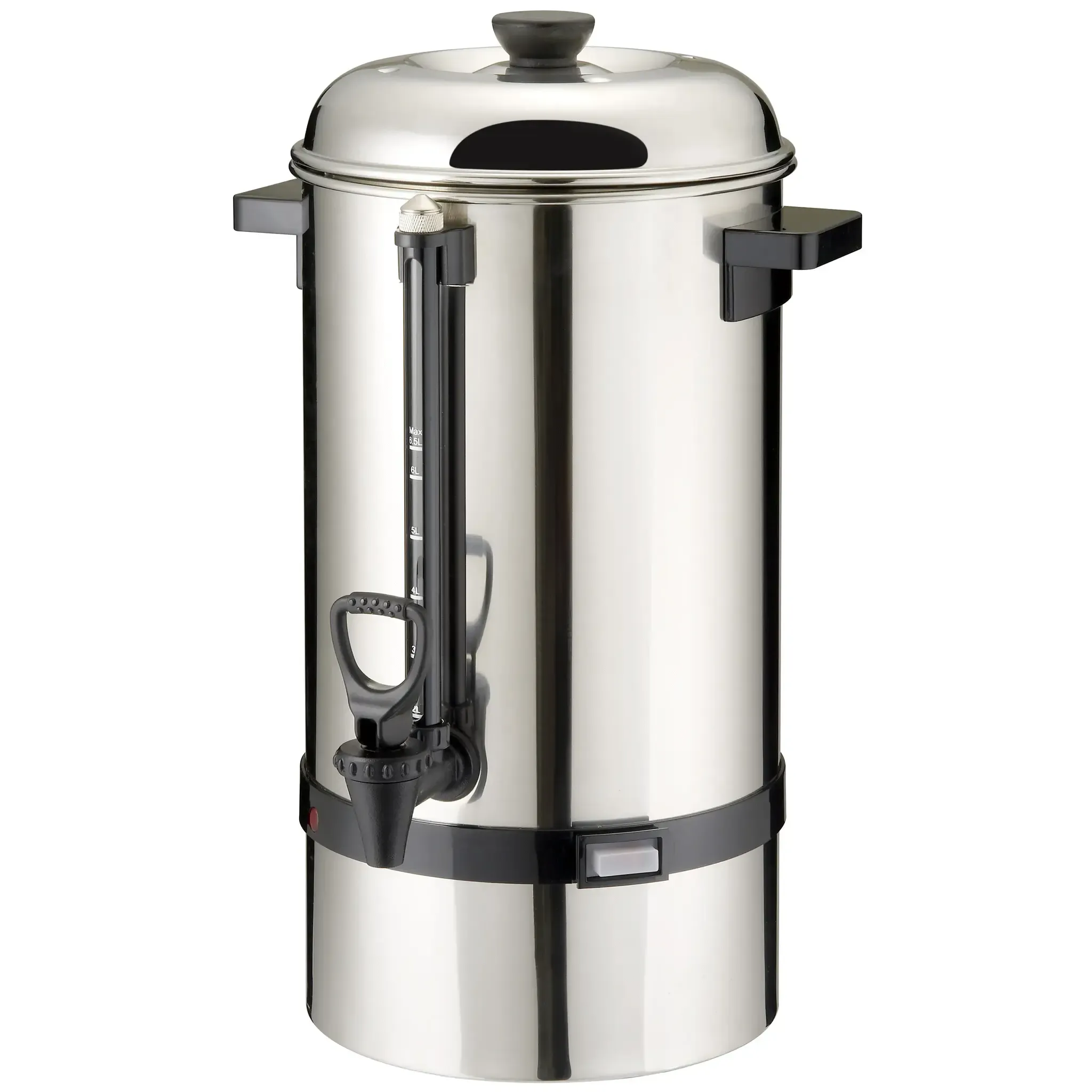 Upgrade your culinary tools with the Adcraft - Admiral Craft Equipment CP-100 Coffee Percolator. Designed for commercial restaurant use, this electric coffee percolator is a must-have for establishments that serve large quantities of coffee. With a 100 cup capacity, it can easily keep up with high demand, ensuring your customers are always satisfied. The automatic temperature control feature ensures that your coffee is brewed at the perfect temperature every time, while the heat-resistant handles make it safe and easy to handle. The red indicator light lets you know when the coffee is ready, and the clear water level gauge allows for easy monitoring. Made of stainless steel with a mirror finish, this percolator is not only durable but also adds a touch of elegance to your coffee station. It comes complete with a stem, coffee filter basket, and cover, making it ready to use right out of the box. Upgrade your coffee brewing game with the Adcraft - Admiral Craft Equipment CP-100 Coffee Percolator.