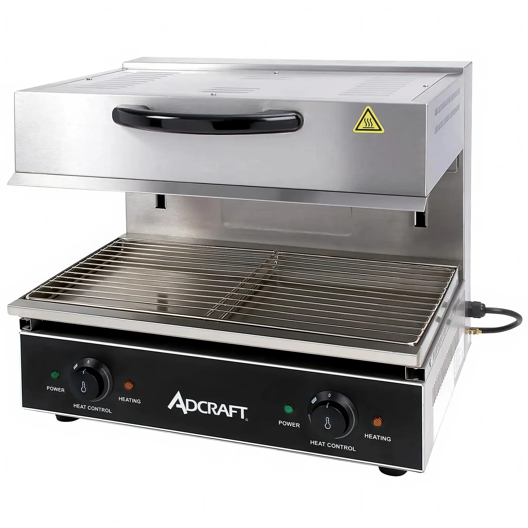 Efficiency for the Modern Chef! Introducing the Adcraft - Admiral Craft Equipment SAL-4000W Salamander Broiler. This electric countertop/wall mounted unit is a game-changer for commercial restaurants. With its adjustable upper housing and independently controlled heating elements, you have complete control over the cooking process. The reflectors radiate heat evenly, ensuring consistent results every time. The infinite control dials allow for precise temperature adjustments, while the Bakelite handle ensures safe and comfortable operation. Cleanup is a breeze thanks to the removable stainless steel drip tray and cooking grate. The rubber feet keep the unit stable during use, and the stainless steel construction guarantees durability and longevity. With a power rating of 4000W and a 240V/60/1-ph electrical configuration, this salamander broiler is ready to handle the demands of a busy commercial kitchen. Upgrade your restaurant's efficiency with the Adcraft - Admiral Craft Equipment SAL-4000W Salamander Broiler.