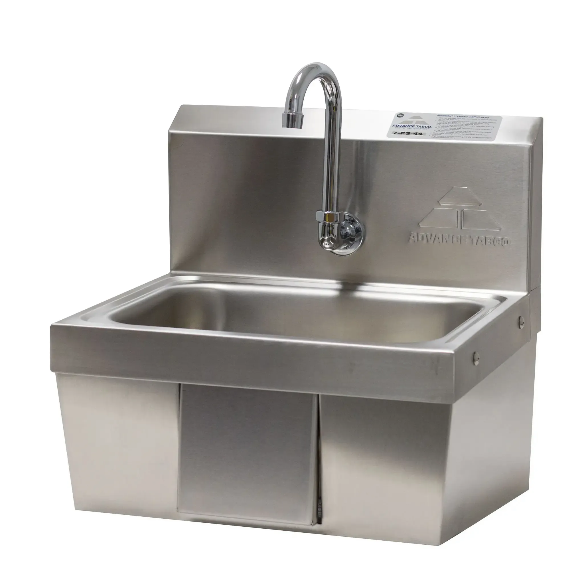 Boost your restaurant's performance with the Advance Tabco, 7-PS-44 Hand Sink. This wall-mounted sink is designed to meet the rigorous demands of a commercial restaurant. Made from durable 18 gauge 304 stainless steel, it is built to withstand heavy use and maintain its quality over time. The 14" wide x 10" front-to-back x 5" deep bowl provides ample space for handwashing, ensuring proper hygiene in the kitchen. The splash-mounted gooseneck faucet and knee-operated push panel make it easy to operate the sink hands-free, promoting efficiency and reducing the risk of cross-contamination. The included basket drain helps to prevent clogs and maintain a clean working environment. NSF and cCSAus certified, this hand sink meets the highest standards of safety and sanitation. Upgrade your restaurant's facilities with the Advance Tabco, 7-PS-44 Hand Sink and enhance both the functionality and cleanliness of your establishment.