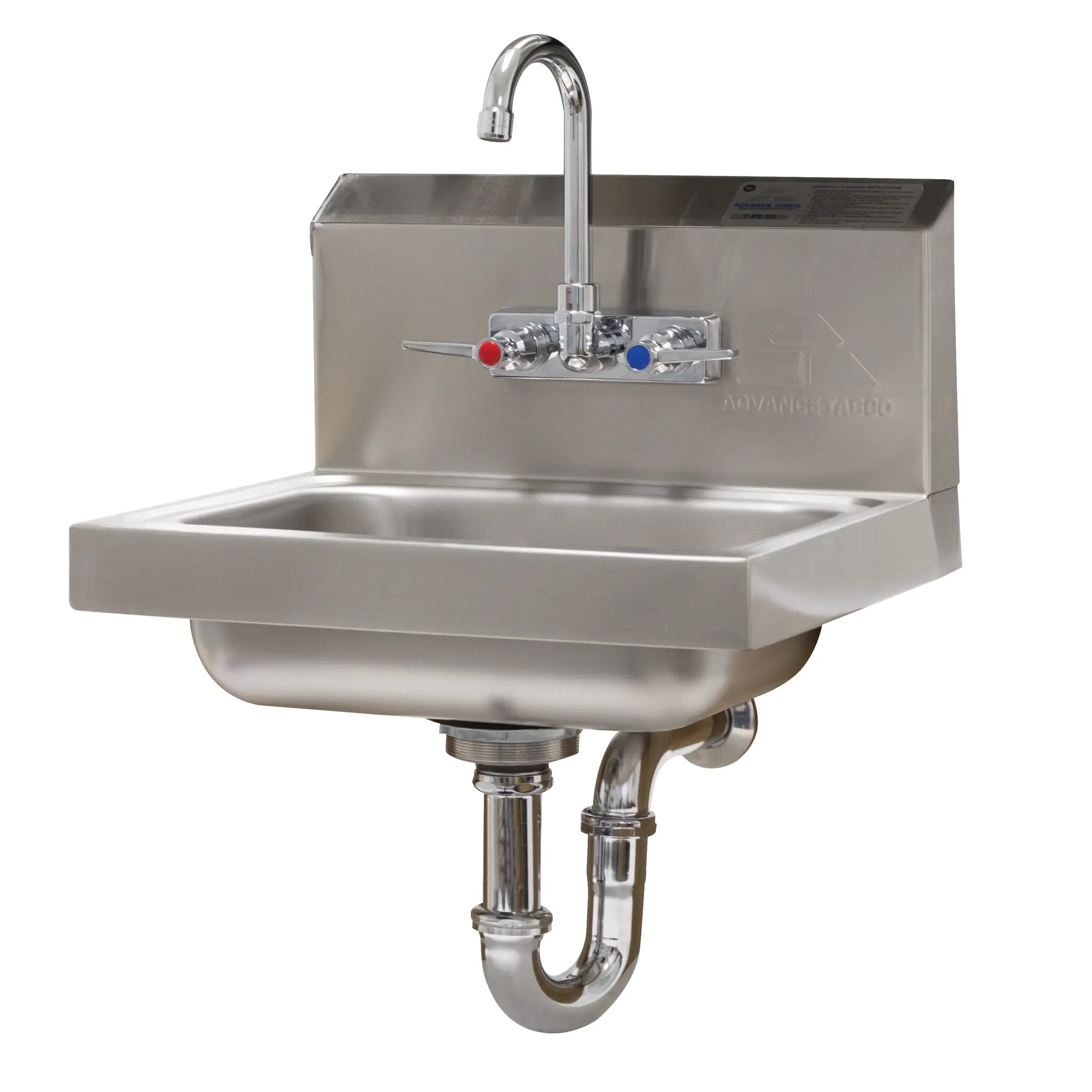 Unleash gastronomic brilliance with the Advance Tabco, 7-PS-54 Hand Sink. This wall-mounted sink is a must-have for any commercial restaurant. With its 14" wide x 10" front-to-back x 5" deep bowl, it provides ample space for handwashing, ensuring optimal hygiene in a busy kitchen. Made from 20 gauge 304 stainless steel, this sink is not only durable but also easy to clean, making it perfect for high-volume use. The splash-mounted gooseneck faucet allows for easy access to water, while the basket drain with P-trap prevents clogs and keeps the sink functioning smoothly. The included wall bracket ensures stability and easy installation. NSF and cCSAus certified, this hand sink meets the highest standards of quality and safety. Upgrade your restaurant's handwashing station with the Advance Tabco, 7-PS-54 Hand Sink and elevate your culinary experience.
