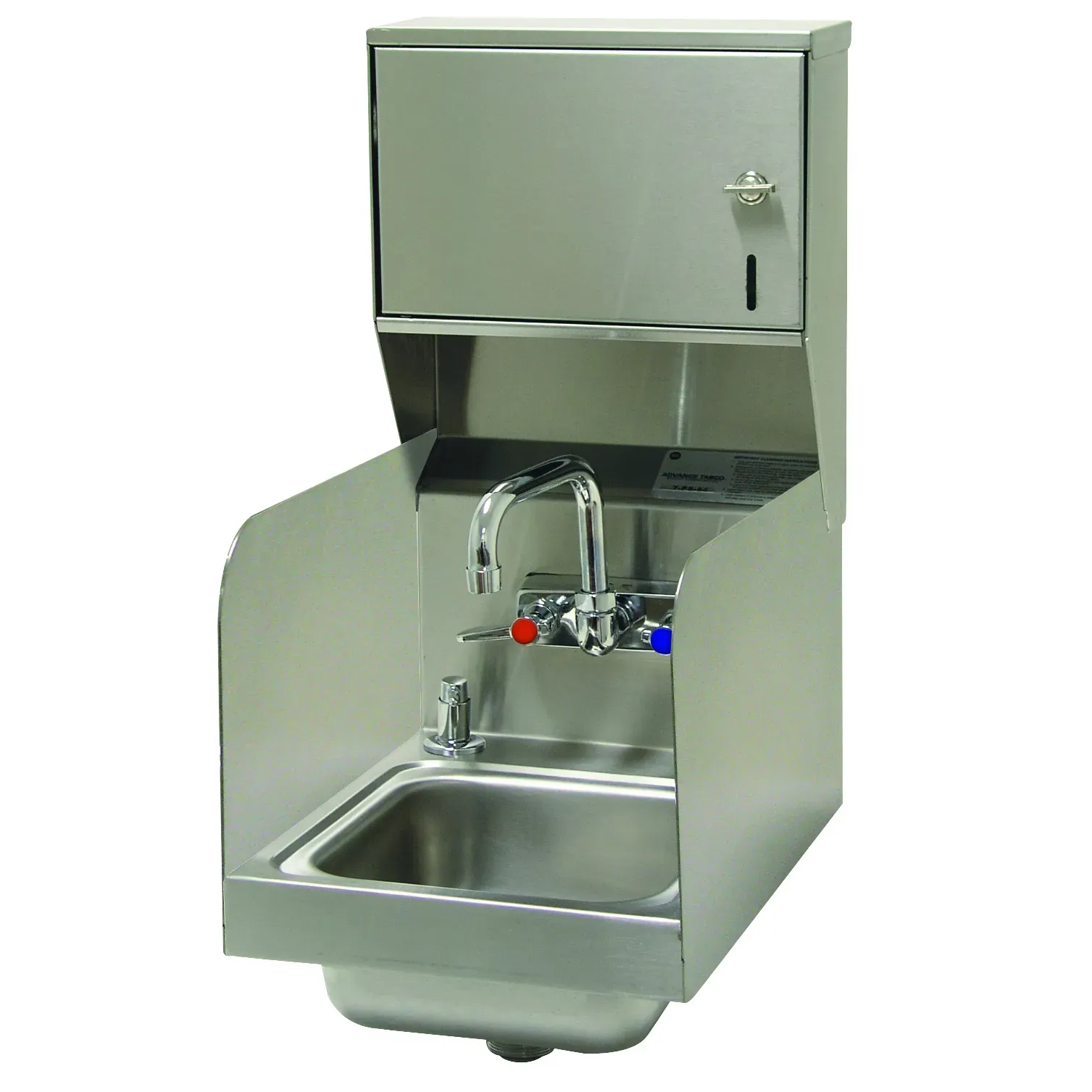 Master your restaurant's kitchen with the Advance Tabco, 7-PS-73 Hand Sink. This wall-mounted sink is designed to meet the needs of a busy commercial restaurant. It features a 9" wide x 9" front-to-back x 5" deep bowl, providing ample space for handwashing. The 20 gauge 304 stainless steel construction ensures durability and longevity, even in a high-volume environment. The left and right side splashes help contain water and prevent splashing, keeping your kitchen clean and safe. The splash-mounted faucet, towel dispenser, and deck-mounted soap dispenser make handwashing convenient and efficient for your staff. The drain with a strainer plate and 1-1/2" IPS connection ensures proper drainage and prevents clogs. NSF and cCSAus certified, this hand sink meets the highest standards of sanitation and safety. Upgrade your restaurant's kitchen with the Advance Tabco, 7-PS-73 Hand Sink and ensure a clean and efficient workspace for your staff.
