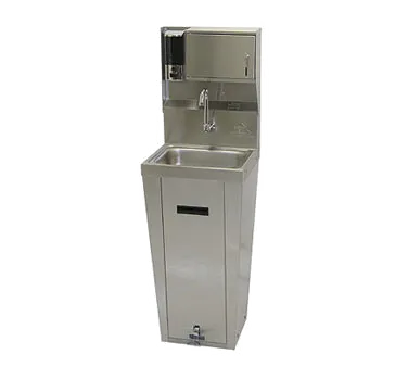 Master the art of flavor with the Advance Tabco, 7-PS-95 Hand Sink. This pedestal-mounted sink is designed to meet the needs of a busy commercial restaurant. The 14" wide x 10" front-to-back x 5" deep bowl provides ample space for handwashing, ensuring proper hygiene in the kitchen. Made from 20 gauge 304 stainless steel, this sink is durable and resistant to corrosion, making it perfect for a high-traffic environment. The splash-mounted faucet, soap, and paper towel dispenser are conveniently located for easy access, promoting cleanliness and efficiency. The pedal valves with an easy access design allow for hands-free operation, reducing the risk of cross-contamination. The basket drain and wall bracket add to the functionality of this sink. NSF and cCSAus certified, this Advance Tabco Hand Sink is a reliable and essential addition to any commercial restaurant.
