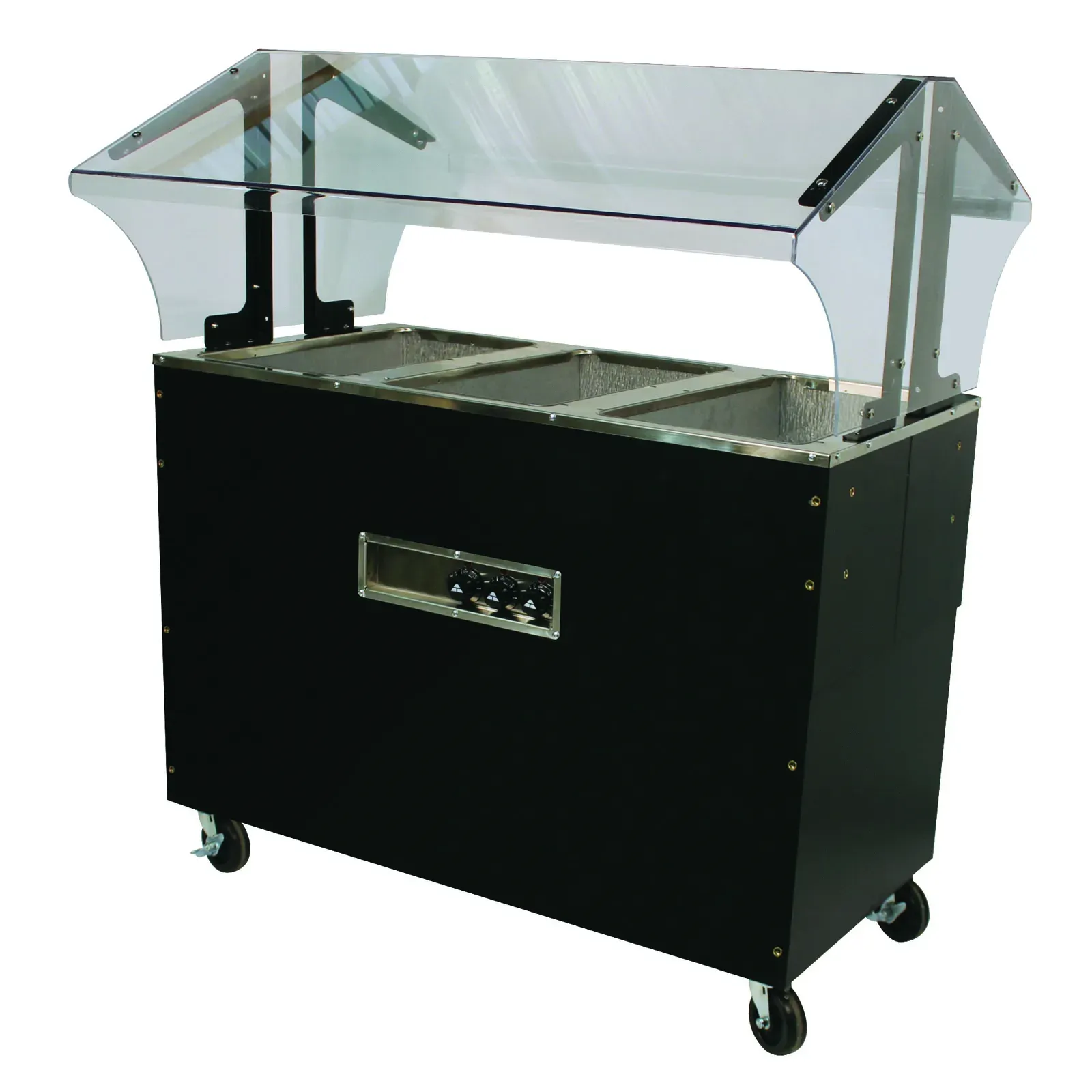 A double-sided sneeze guard provides an added layer of hygiene, protecting your food from contaminants while allowing easy access for both staff and customers. The enclosed base offers additional storage space, keeping your serving area tidy and organized. The black vinyl clad finish adds a sleek, professional look that complements any restaurant decor.