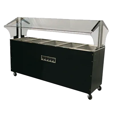 The Portable Hot Food Buffet Table features a double-sided sneeze guard, ensuring food safety and hygiene from both sides of the table. Equipped with five 12" x 20" galvanized wells, this buffet table requires spillage pans to maintain cleanliness and efficiency. Each well is controlled individually with infinite controls and indicator lights, allowing precise temperature management for a variety of dishes.