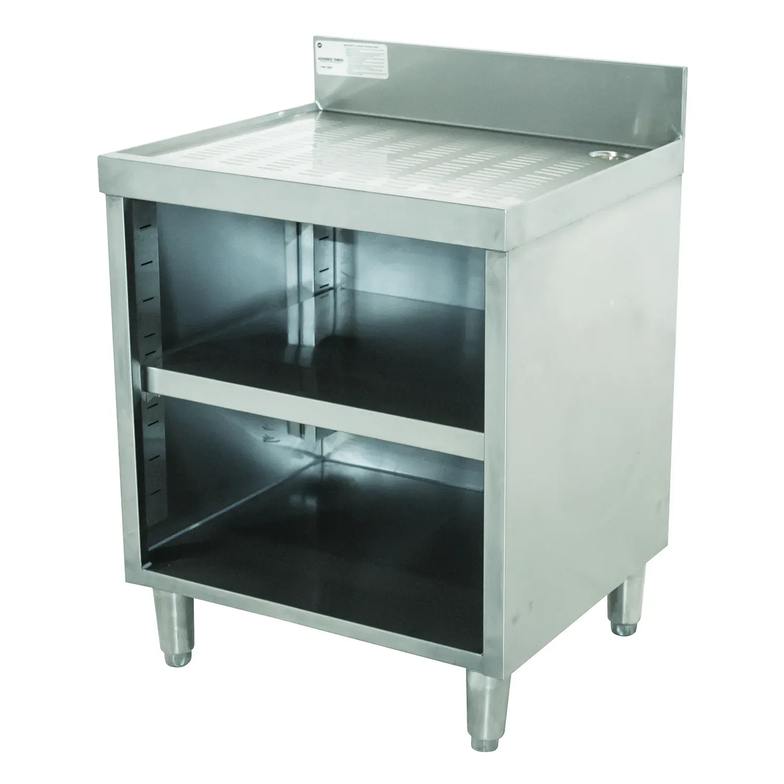 Measuring 24 inches wide, 21 inches deep, and 33 inches high, the Advance Tabco Underbar Basics Drainboard offers ample space for drying and organizing glassware, utensils, and other essentials. The open cabinet base with a mid-shelf provides additional storage, ensuring that your workspace remains clutter-free and organized.