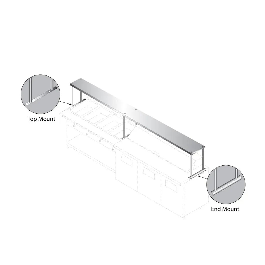 Maximize space and utility with the Overshelf, a single-tier solution designed to enhance your kitchen's efficiency. Measuring 108 inches in width and 18 inches in depth, this robust overshelf is crafted from durable 18/430 stainless steel, ensuring longevity and easy maintenance in the demanding environment of a commercial kitchen.