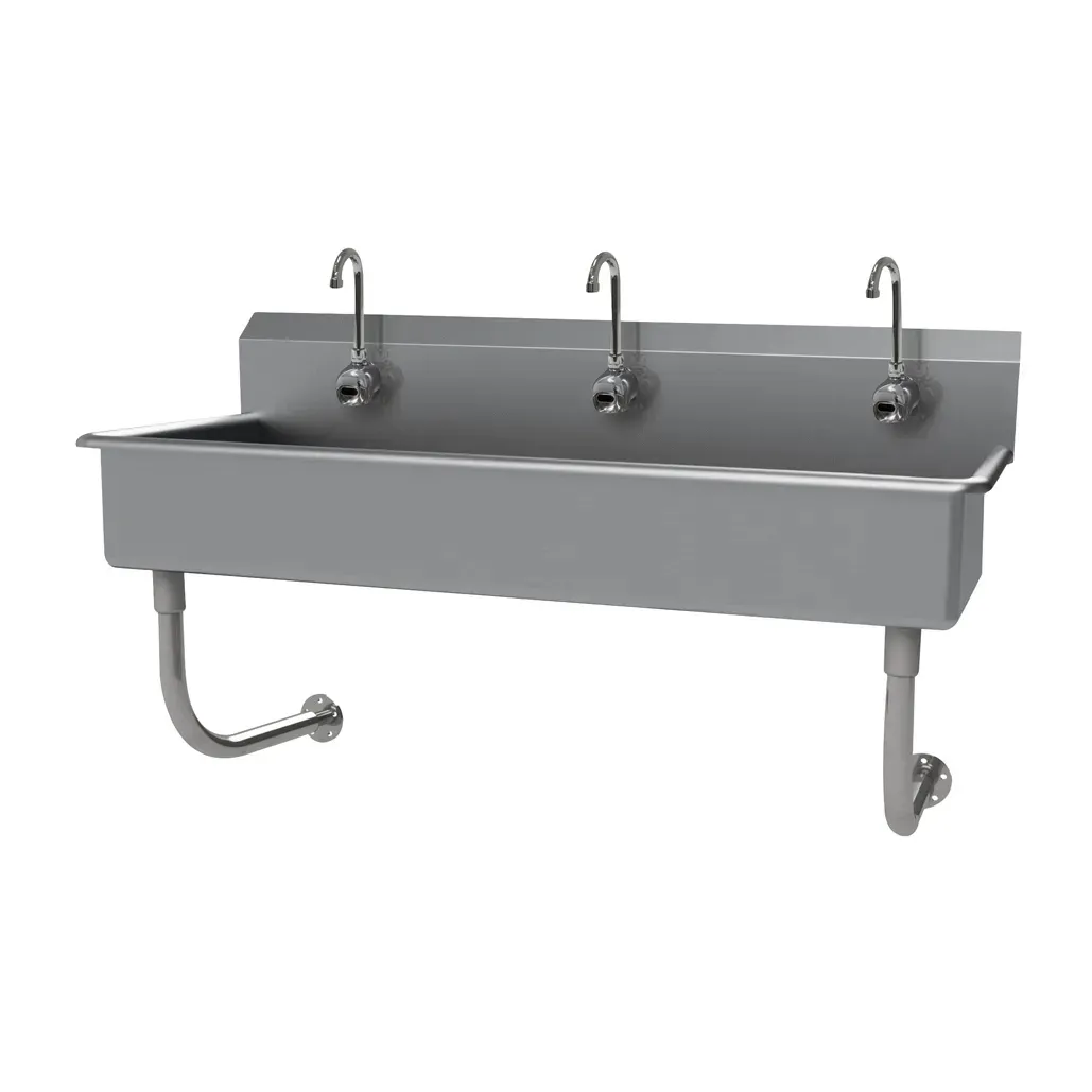 Cook with precision using the Advance Tabco FC-WM-60EF Hand Sink. This wall-mounted sink is designed for commercial restaurant use, ensuring durability and functionality. Made with 16 gauge 304 stainless steel construction, it can withstand the demands of a busy kitchen. The sink features three electronic faucets, allowing for easy and hygienic handwashing. With a spacious 60"W x 19-1/2"D x 29-1/2"H overall size and a 16" front-to-back x 8" deep bowl, there is plenty of room for multiple users. The sink also includes an 8-1/2"H backsplash and is punched with three single faucet holes. It comes with a 3-1/2" rear basket drain for efficient water drainage. The tubular stainless steel wall supports provide stability and support. NSF certified, this Advance Tabco hand sink is a reliable and essential addition to any commercial kitchen.