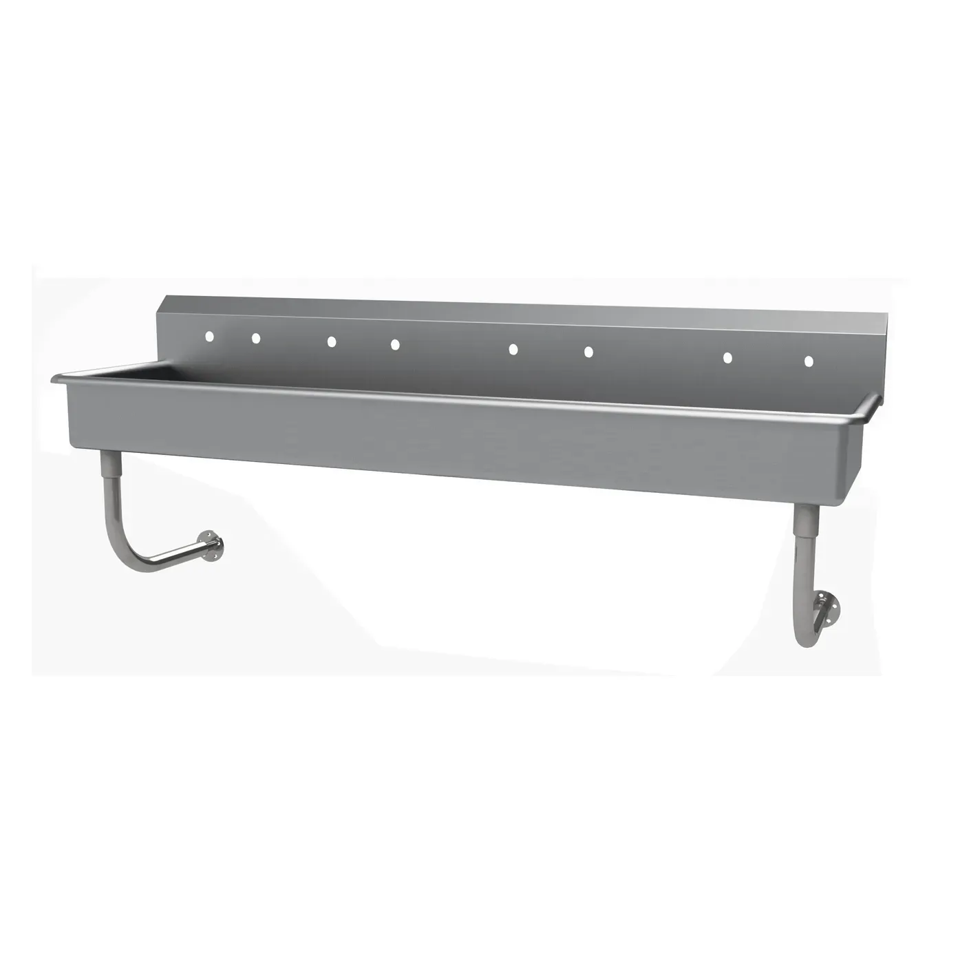 Equip your kitchen for success with the Advance Tabco FC-WM-80-ADA Hand Sink. This wall-mounted sink is designed to meet the needs of a busy commercial restaurant. With its spacious 80"W x 19-1/2"D x 25-1/2"H dimensions, it provides ample space for multiple users to wash their hands simultaneously. The 16" front-to-back x 5" deep bowl size ensures that there is enough room for thorough handwashing. The sink is made of durable 16 gauge 304 stainless steel construction, ensuring its longevity in a commercial kitchen environment. It is also NSF certified and ADA compliant, making it suitable for all customers and meeting health and safety regulations. The sink comes with a backsplash and four sets of faucet holes, allowing for easy installation and customization. With its tubular stainless steel wall supports, this hand sink is built to withstand heavy use and is a valuable addition to any commercial restaurant.