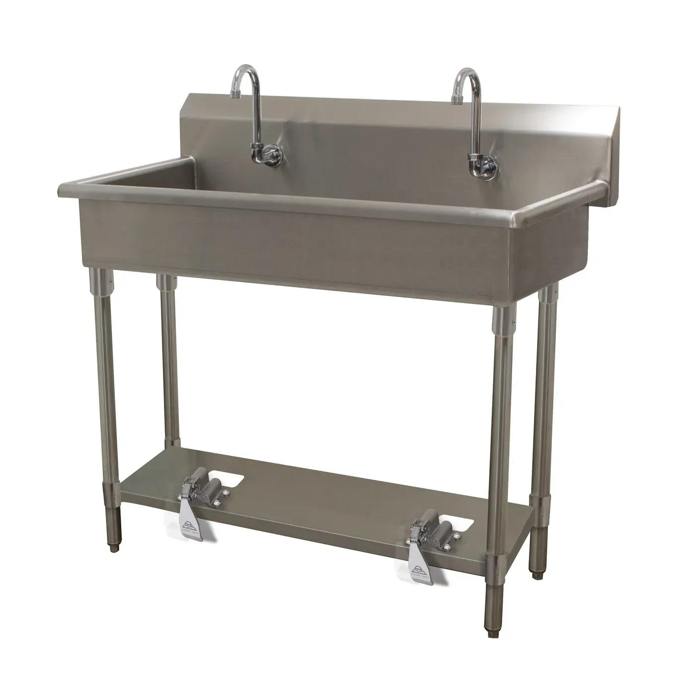 Simplify restaurant operations with the Advance Tabco FS-FM-40FV Hand Sink. This multiwash hand sink is designed to meet the needs of busy commercial kitchens. With its 40" width and 19-1/2" depth, it provides ample space for handwashing. The 16" front-to-back and 8" deep bowl size ensures that there is enough room to comfortably wash hands. The sink is equipped with a toe-operated push valve, allowing for hands-free operation and promoting hygiene. The 8-1/2" backsplash helps to keep the surrounding area clean and prevents water from splashing onto other surfaces. Made of 14 gauge 304 stainless steel, this sink is durable and resistant to corrosion, ensuring long-lasting performance. It comes with stainless steel legs and flanged feet for stability and a pedal bracket support for easy installation. The sink also includes a 3-1/2" rear basket drain for efficient water drainage. NSF certified, this hand sink meets the highest standards of sanitation and is perfect for commercial restaurant use.