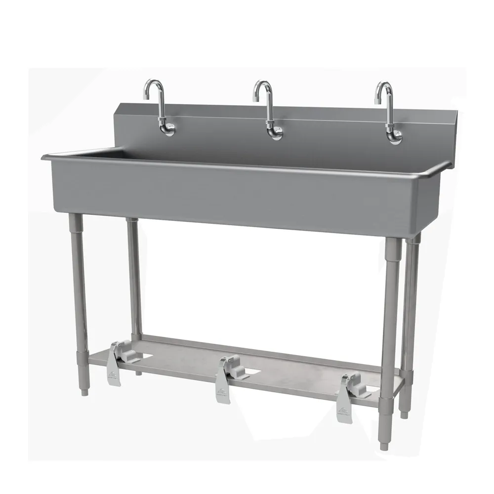 Introducing the Advance Tabco FS-FM-60FV Hand Sink, the perfect addition to dominate the culinary world in your commercial restaurant. This multiwash hand sink is designed to accommodate three people at once, ensuring efficient and hygienic handwashing for your staff. With toe-operated push valves, this sink allows for hands-free operation, minimizing the risk of cross-contamination. The 14 gauge 304 stainless steel construction ensures durability and longevity, even in the busiest kitchen environments. The sink features a spacious 16" front-to-back x 8" deep bowl size, providing ample space for thorough handwashing. The gooseneck spouts and three single faucet holes allow for easy installation of faucets. The sink also includes stainless steel legs and flanged feet for stability, as well as a pedal bracket support for added convenience. NSF certified, this hand sink meets the highest standards of cleanliness and sanitation. Upgrade your restaurant's handwashing station with the Advance Tabco FS-FM-60FV Hand Sink and take control of your culinary empire.