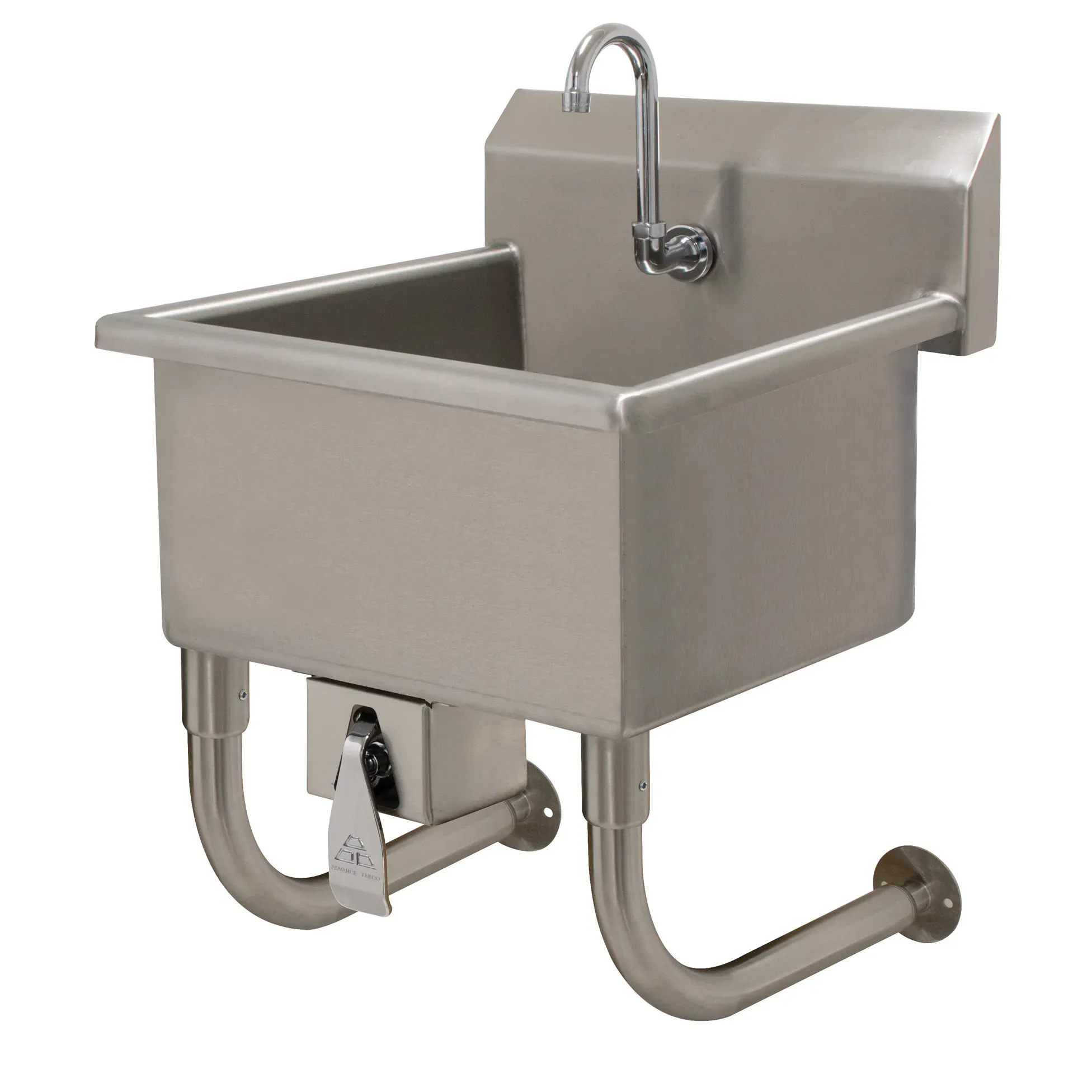 Transform your food service with the Advance Tabco FS-WM-2721KV Hand Sink. This wall-mounted service sink is designed to meet the demands of a busy commercial restaurant. The sink features a 27"W x 21-1/2"D x 8" deep bowl, providing ample space for washing and rinsing dishes, utensils, and hands. The 14-gauge stainless steel construction ensures durability and longevity, even in the most demanding kitchen environments. The sink also includes a convenient knee valve for hands-free operation, allowing your staff to maintain proper hygiene while multitasking. The gooseneck spout and single faucet hole make it easy to fill and rinse large pots and pans. With its 8-1/2"H backsplash and stainless steel tubular wall supports, this sink is not only functional but also easy to clean and maintain. NSF certified, this Advance Tabco hand sink is a reliable and essential addition to any commercial restaurant.
