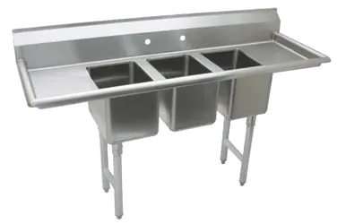 Enhance your commercial kitchen with the Advance Tabco, K7-CS-22, Sink, (3) Three Compartment. This convenience store sink is designed to meet the demands of a busy restaurant environment. With its three compartments and left and right-hand drainboards, this sink provides ample space for washing, rinsing, and sanitizing dishes, utensils, and cookware. The 14" front-to-back x 10" W compartments are 10" deep and come with 8"H backsplashes to prevent water from splashing onto the surrounding area. The stainless steel open frame base with side crossrails ensures stability and durability, while the adjustable metal bullet feet allow for easy leveling on uneven surfaces. Made of 18 gauge 304 stainless steel, this sink is built to withstand the rigors of daily use in a commercial kitchen. The 17-5/8" drainboards provide additional workspace for drying dishes. Upgrade your kitchen with the Advance Tabco, K7-CS-22, Sink, (3) Three Compartment and experience the convenience and efficiency it brings to your restaurant operations.