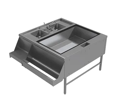 The Prestige Double Service Station features a pass-thru ice bin on the right, complete with a 10-circuit cold plate, ensuring your beverages stay perfectly chilled. With a 70 lb ice capacity, you can handle high-demand periods with ease. On the left side, you'll find two Deep Drawn hand sinks equipped with a single faucet and a soda tubing chase, providing a convenient and hygienic solution for your staff.