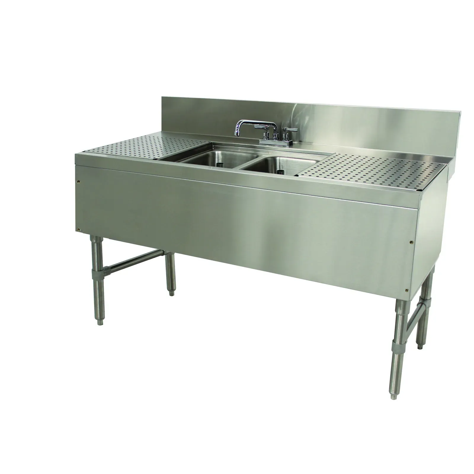 Upgrade your kitchen' s versatility with the Prestige Underbar Sink Unit from Advance Tabco. This high-quality unit, model PRB-24-42C, is designed to meet the rigorous demands of a busy restaurant environment. With its 48"W x 25"D x 36"H dimensions, it offers ample space for efficient kitchen operations. The Prestige Underbar Sink Unit features two 14" front-to-back x 10" left-to-right x 10" deep sink bowls, providing plenty of room for washing and rinsing tasks. The inclusion of 12" drainboards on both the left and right sides ensures that your workspace remains organized and clutter-free. The 7"H backsplash helps protect your walls from splashes and spills, maintaining a clean and hygienic kitchen environment. Constructed from durable stainless steel, this unit is built to withstand the daily wear and tear of a commercial kitchen. The open frame base and side crossrails add to its stability and strength, ensuring long-lasting performance. Additionally, the Prestige Underbar Sink Unit comes with a deck mount faucet featuring a 6" swing spout, offering flexibility and ease of use. NSF certified, this sink unit meets the highest standards for public health and safety, making it an excellent choice for any restaurant. Enhance your kitchen' s efficiency and functionality with the Prestige Underbar Sink Unit from Advance Tabco, and experience the perfect blend of durability and practicality.