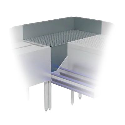 The Prestige Corner Filler features a 7" high backsplash, ensuring that your kitchen remains clean and sanitary by preventing spills and splashes from reaching the walls. The removable perforated 18/300 stainless steel drainboard top, equipped with a 1" drain, offers a practical solution for drying and draining, making it an indispensable tool for any busy kitchen.