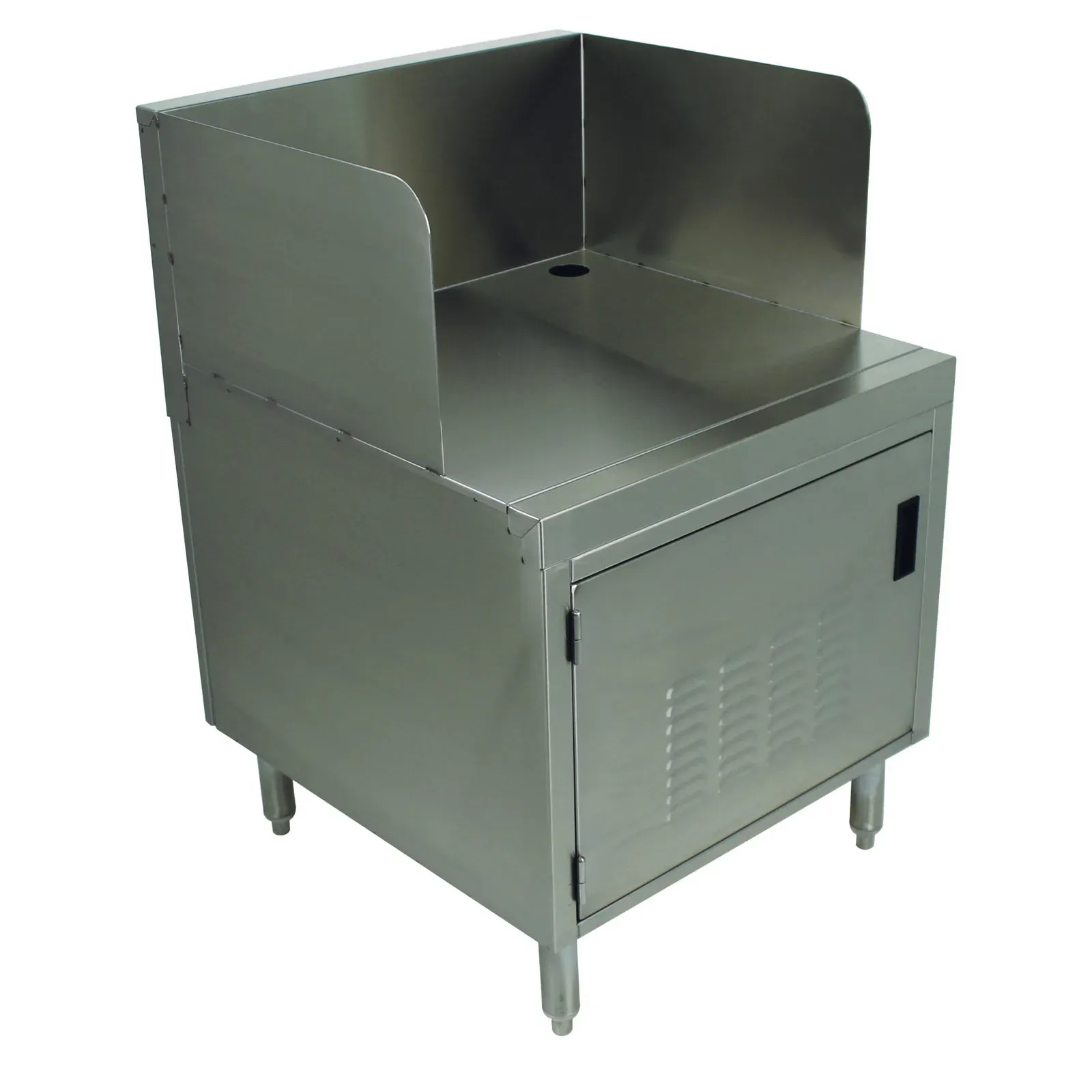 Crafted from high-quality 18 gauge 300 series stainless steel, the flat top features a 2" access hole for electrical cables, ensuring a clean and organized workspace. The 12"H backsplash protects your walls from spills and splashes, making cleanup a breeze. The louvered door with a flush handle not only adds a sleek look but also ensures easy access to the cabinet's interior.