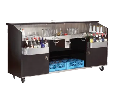 Upgrade your kitchen' s versatility with the Advance Tabco Portable Bar, a must-have addition for any restaurant looking to enhance its service efficiency and style. Measuring 95-3/4"W x 24-1/2"D x 47"H, this portable bar is designed to meet the demands of a bustling restaurant environment. The Advance Tabco Portable Bar features a robust stainless steel work top, ensuring durability and easy maintenance. It comes equipped with (2) ice bins, each with its own drain valve and locking door, providing ample space for ice storage and security. The (4) bottle storage compartments make it easy to organize and access your most popular beverages quickly. For added convenience, the bar includes a bottle catcher and (2) towel rings, ensuring that your bartenders have everything they need within arm' s reach. The (2) stainless steel speed rails are perfect for holding frequently used bottles, allowing for swift and efficient service. Additionally, the rear lower shelf offers extra storage space for additional supplies or equipment. The sleek black finish of the Advance Tabco Portable Bar adds a touch of elegance to any setting, while the (4) 5" casters, (2) of which are braked, provide mobility and stability, making it easy to reposition the bar as needed. Whether you' re hosting a special event or simply need a versatile bar setup, the Advance Tabco Portable Bar is the ideal solution for your restaurant. Enhance your service capabilities and impress your guests with this high-quality, functional, and stylish portable bar.