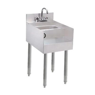 The Advance Tabco Underbar Basics Blender Station features an 18"W x 23"D x 33"H overall dimension, making it compact yet highly functional. The 4" backsplash ensures cleanliness by preventing spills and splashes from reaching your walls. The station includes a 10"W x 14"D x 7" deep sink bowl equipped with a splash-mounted swing spout faucet, providing a convenient and efficient way to handle quick rinses and dumps.