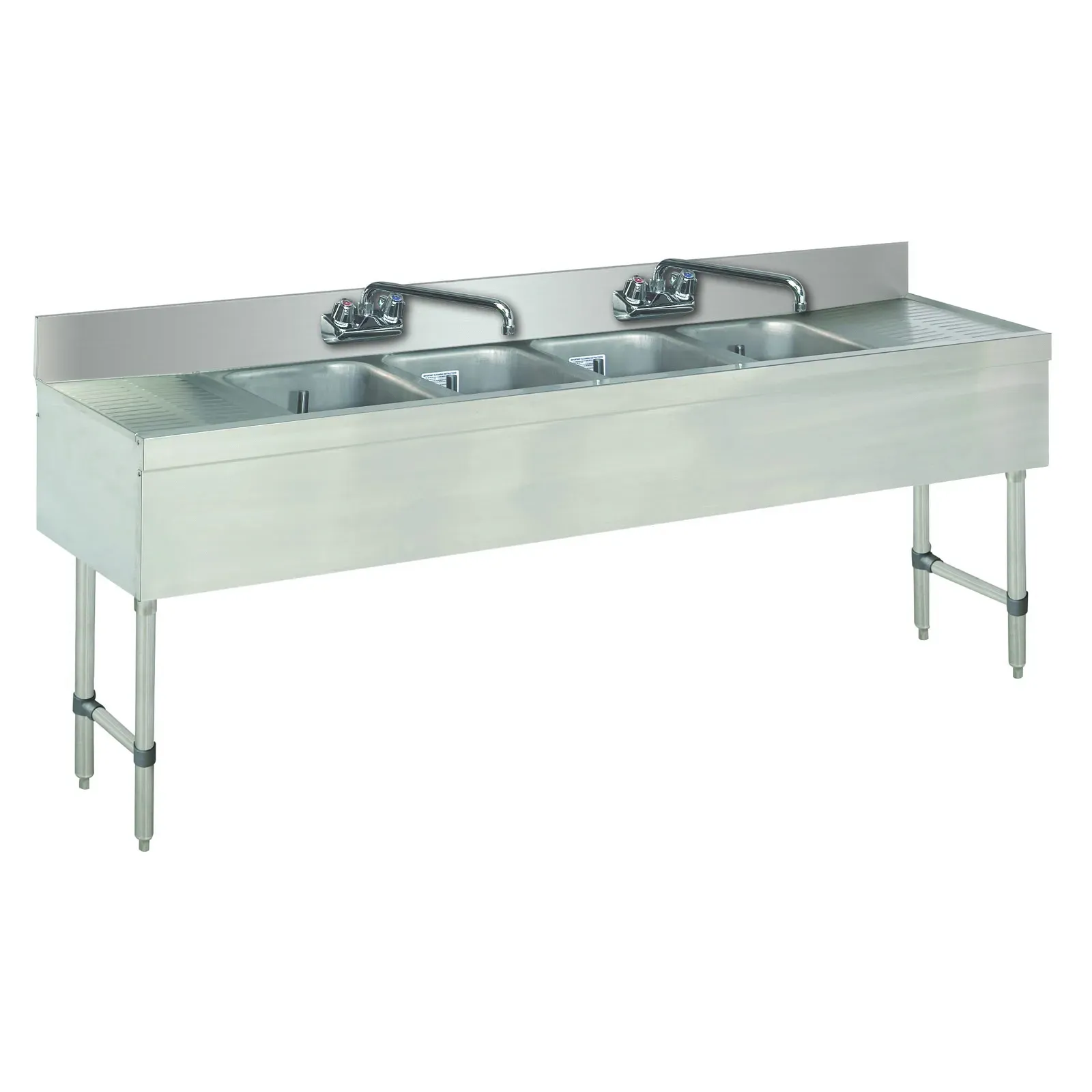 The Advance Tabco Special Value Sink Unit features four 10"W x 14"D x 10" deep sink bowls, each crafted with Deep Drawn technology to ensure durability and ease of cleaning. The unit includes a 4"H backsplash to protect your walls from splashes and spills, maintaining a clean and hygienic workspace. Two splash-mounted faucets with 6" spouts are strategically placed for convenient water access, enhancing the functionality of the sink.