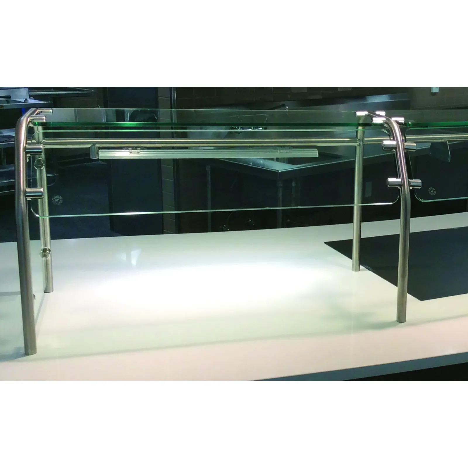 The Advance Tabco Food Shield stands 20 inches tall and is constructed with 1/4-inch thick heat-tempered glass front and side panels. These side panels are 18 inches deep, meeting NSF requirements for safety and durability. The top glass is even sturdier, with a 3/8-inch thickness, offering robust protection while maintaining a sleek, modern appearance.