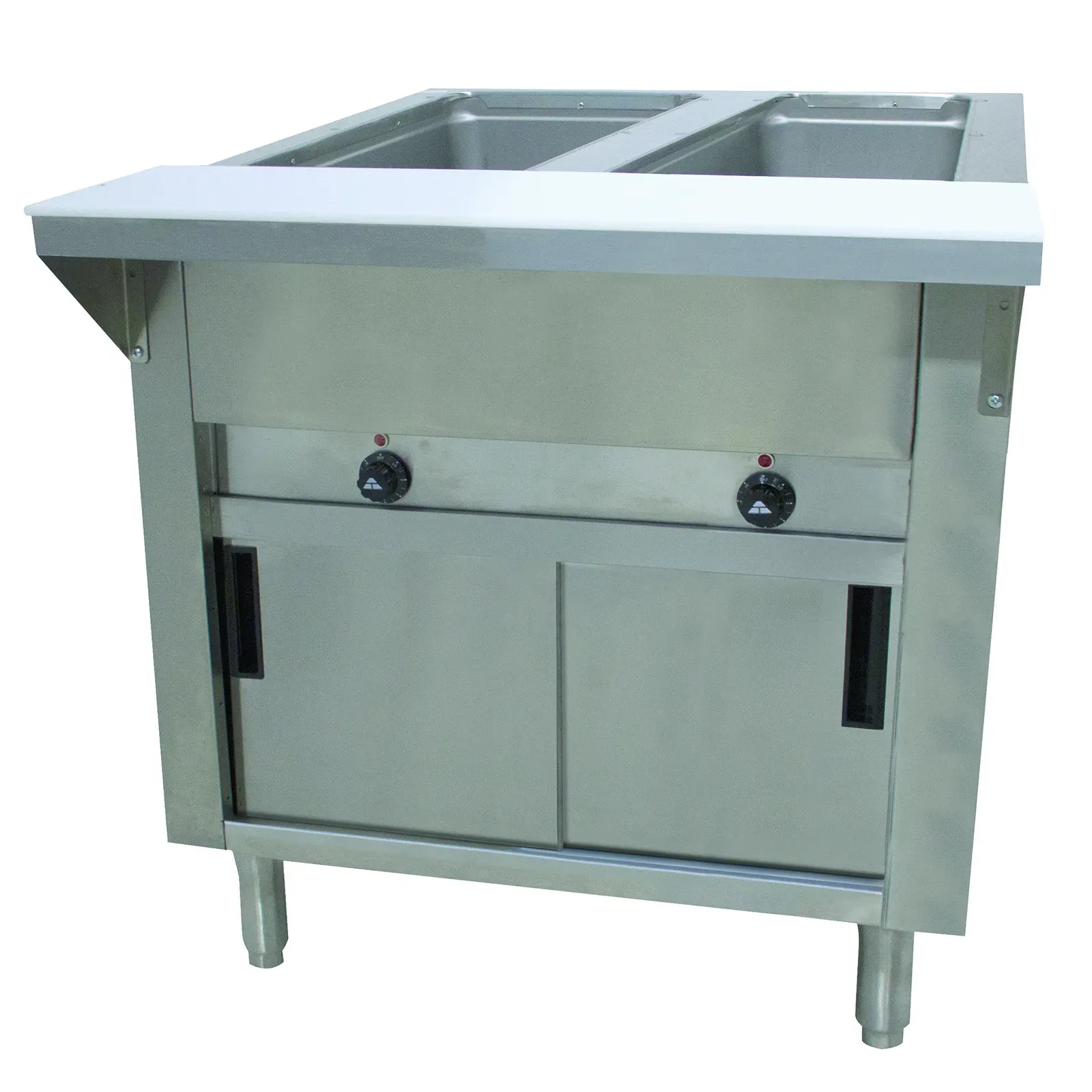 Constructed from durable stainless steel, this hot food table is built to withstand the rigors of daily use in a commercial kitchen. The enclosed base with (2) sliding doors offers convenient storage for utensils, ingredients, or other kitchen essentials, keeping your workspace tidy and organized. Additionally, the 3/8" thick poly cutting board provides a sturdy surface for food preparation, enhancing the functionality of this versatile unit.