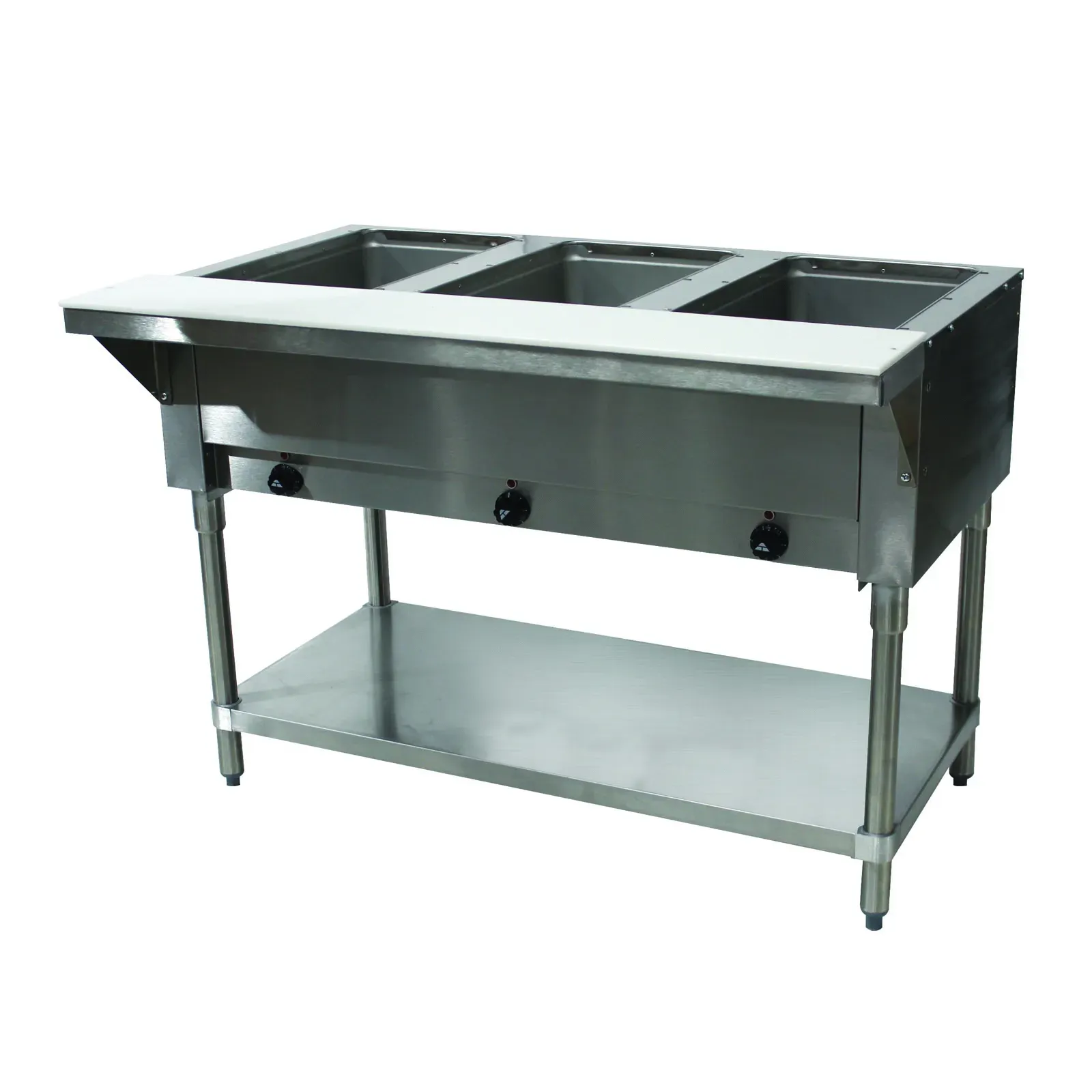 Constructed with stainless steel well liners, this hot food table is built to withstand the rigors of a busy kitchen. The 3/8" thick poly cutting board provides a convenient prep area, while the galvanized open base with an undershelf offers additional storage space for your kitchen essentials.