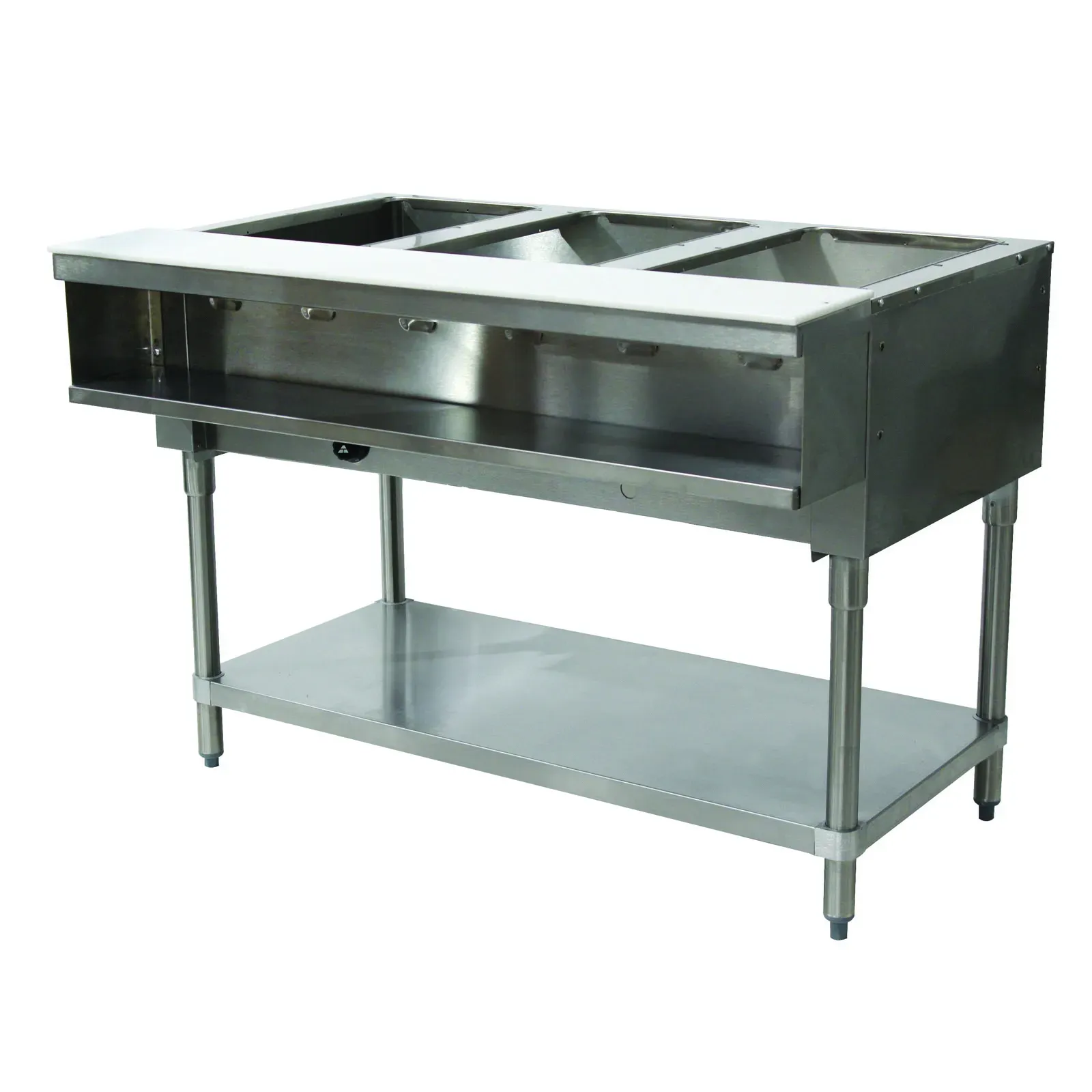 The Water Bath Hot Food Table features three 12" x 20" well openings, accommodating pan inserts up to 7-3/4" deep, making it versatile for various dishes. The stainless steel top provides durability and easy cleaning, essential for maintaining hygiene standards in a busy kitchen. Additionally, the table includes an 8" D x 3/8" thick poly cutting board with a stainless plate shelf below, offering a convenient prep area.