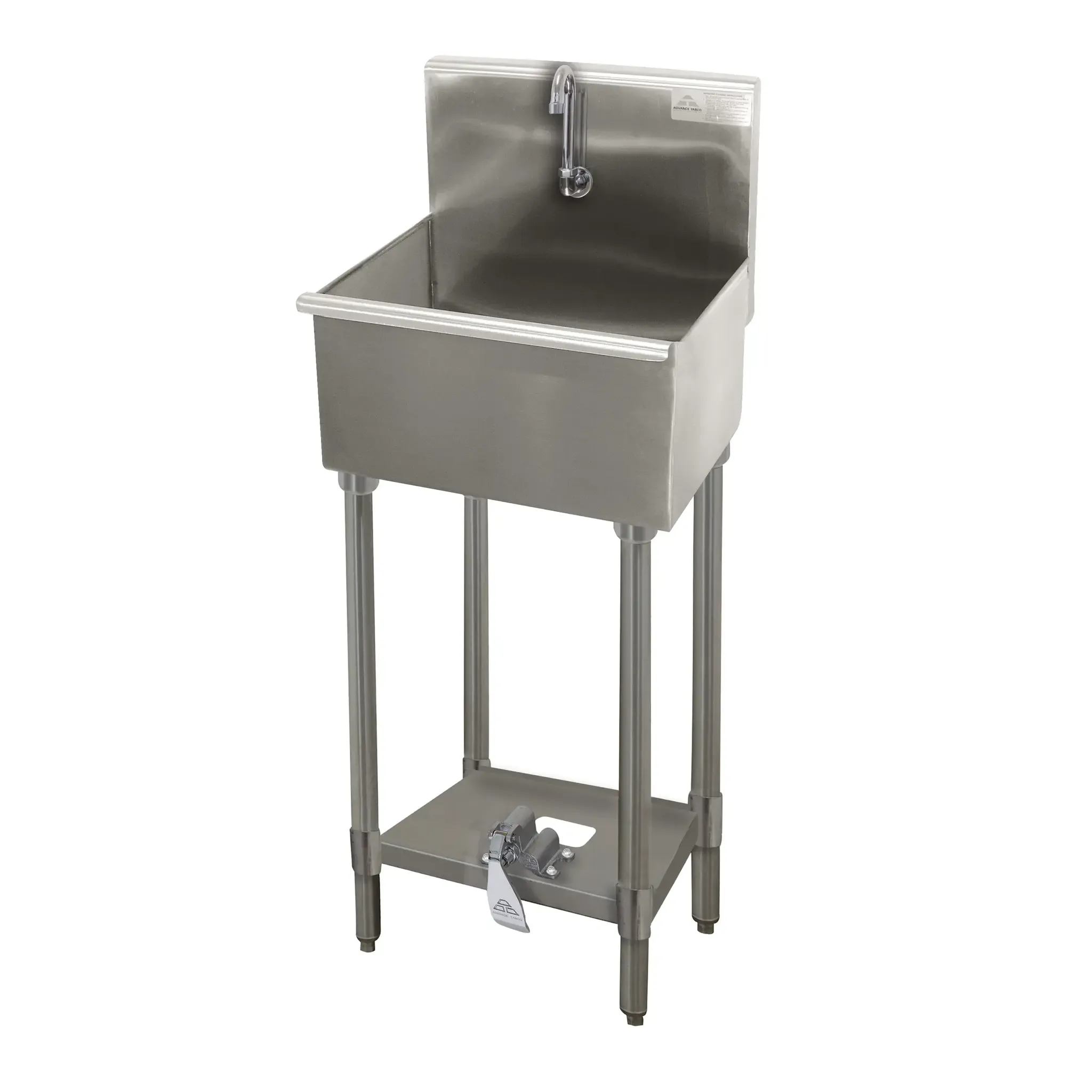 Take your kitchen to the next level with the Advance Tabco WSS-14-21FV-FM Hand Sink. This floor model sink is designed specifically for commercial restaurant use, providing a convenient and efficient solution for handwashing. The sink features a toe-operated push valve, allowing for hands-free operation and ensuring optimal hygiene. With its 16 gauge 304 stainless steel construction, this sink is built to withstand the demands of a busy kitchen environment. The 18" wide x 14" front-to-back x 12" deep bowl provides ample space for washing and rinsing, while the 8-1/2" backsplash helps to keep the surrounding area clean and dry. The sink also includes a gooseneck spout and a single faucet hole, making it easy to install and use. Complete with stainless steel legs and flanged feet, as well as a pedal bracket support, this hand sink is a durable and reliable addition to any commercial kitchen. Upgrade your restaurant's handwashing station with the Advance Tabco WSS-14-21FV-FM Hand Sink.