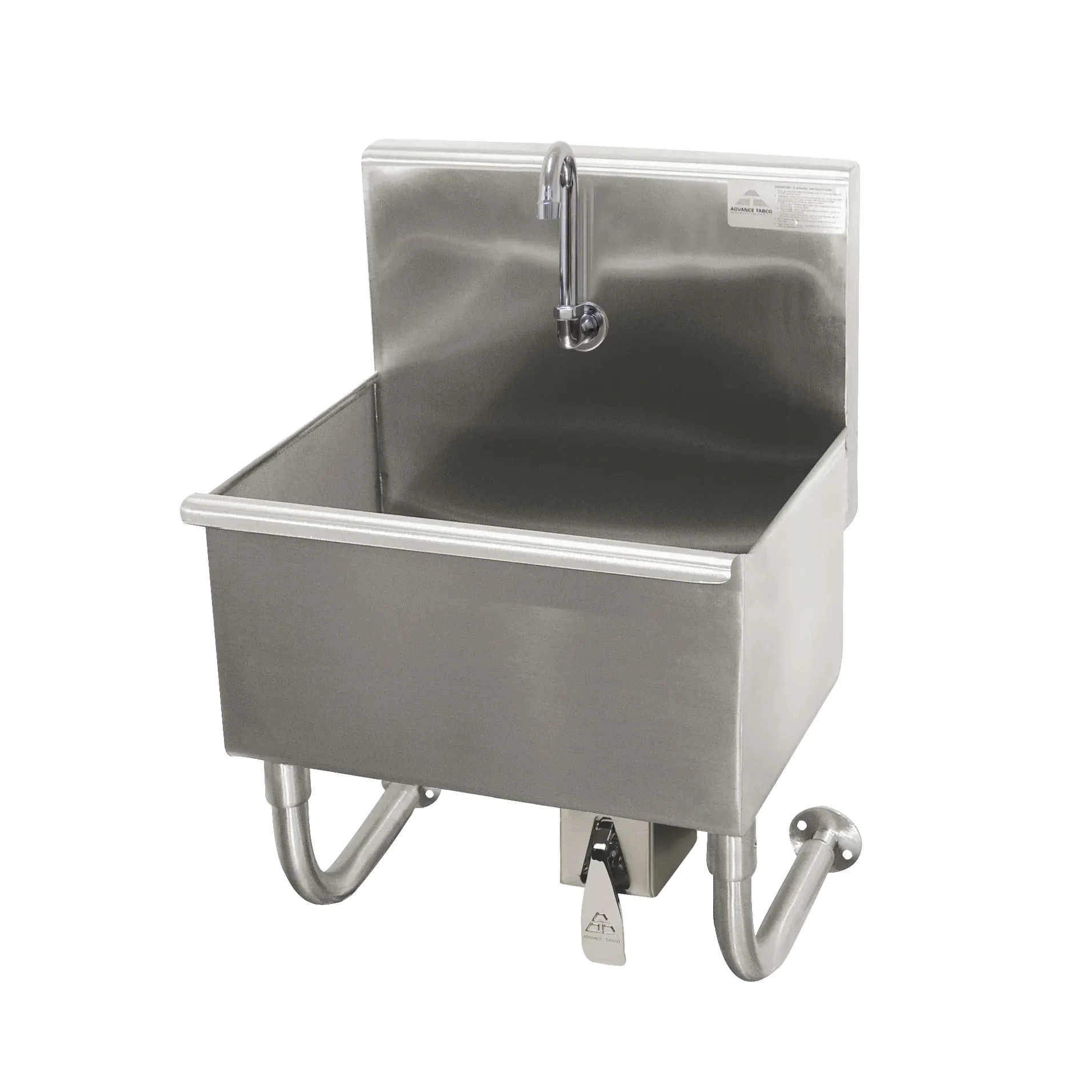 Unleash your kitchen's potential with the Advance Tabco WSS-14-21KV Hand Sink. This wall-mounted service sink is designed to meet the demands of a busy commercial restaurant. Made from durable 16 gauge 304 stainless steel, it is built to withstand the rigors of daily use. The 18" wide x 14" front-to-back x 8" deep bowl provides ample space for washing and rinsing dishes, while the 8-1/2" backsplash helps keep the surrounding area clean and dry. The single faucet hole and gooseneck spout make it easy to fill and empty the sink, while the included 3-1/2" basket drain prevents clogs. With its tubular wall brackets, this hand sink can be securely mounted to any wall. Upgrade your kitchen with the Advance Tabco WSS-14-21KV Hand Sink and experience the convenience and durability it brings to your restaurant operations.