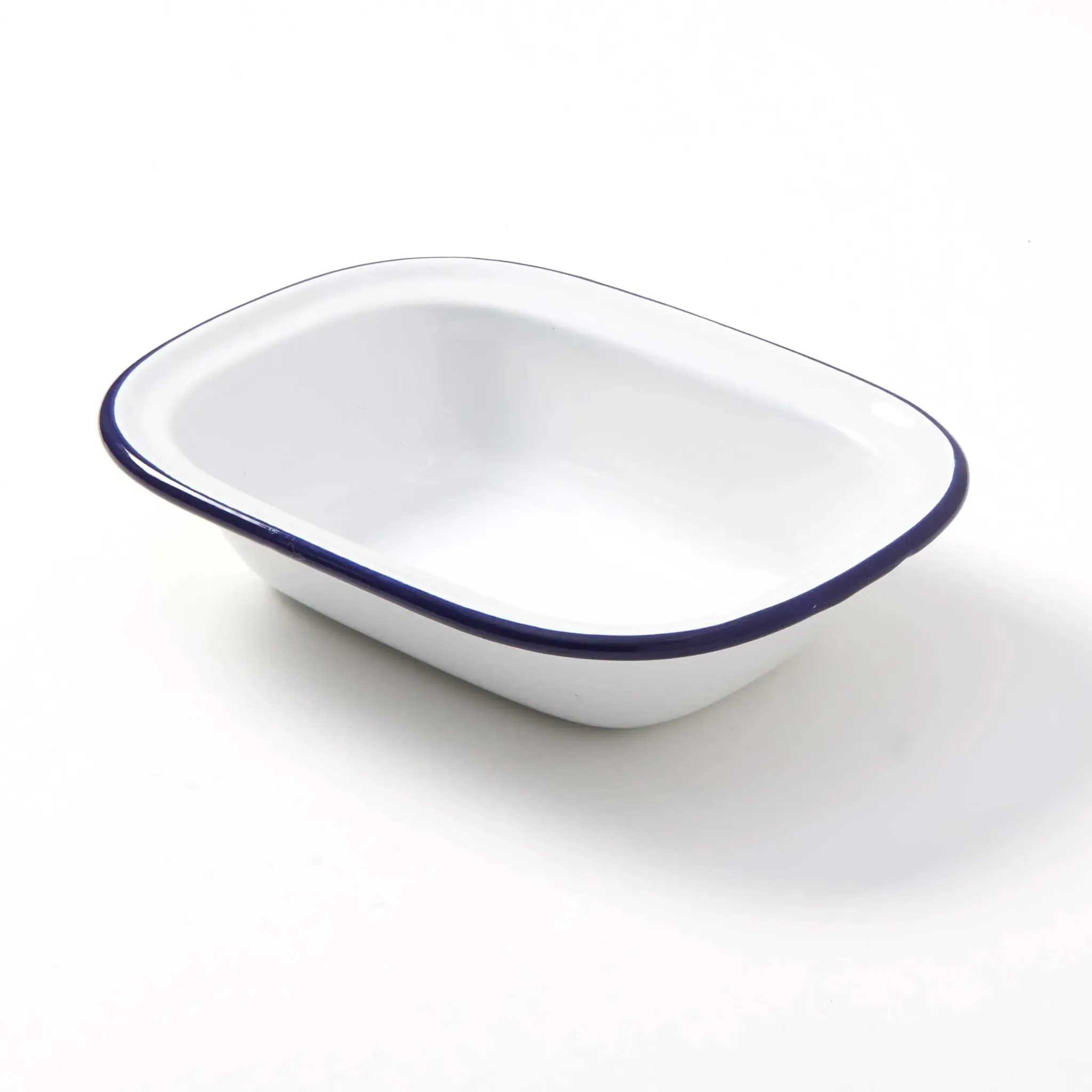 Dine with Unmatched Style with the American Metalcraft EWB8 Bowl. This enamelware bowl is the perfect addition to any commercial restaurant setting. Crafted with enamel coated steel, it offers durability and longevity, ensuring it can withstand the demands of a busy kitchen. The oblong shape and 16 oz. capacity make it ideal for serving a variety of dishes, from soups and salads to pasta and desserts. The white color with a blue rim adds a touch of elegance to your table presentation, while the hand wash only requirement ensures easy maintenance. With American Metalcraft's reputation for quality and the EWB8's versatility, this bowl is a must-have for any restaurant looking to elevate their dining experience.