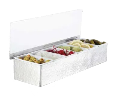Revolutionize Your Space with the American Metalcraft HMCD4 Bar Condiment Holder. This stainless steel dispenser is designed to enhance the efficiency and organization of your commercial restaurant. With its 4-compartment design, it allows you to neatly store and display a variety of condiments, making it easy for your staff to access and serve customers quickly. The hammered finish adds a touch of elegance to any countertop, elevating the overall aesthetic of your establishment. Measuring 12"L x 5-3/4"W x 3-1/2"H, this condiment holder is compact yet spacious enough to accommodate all your essential condiments. Whether you're serving ketchup, mustard, mayonnaise, or other sauces, this dispenser ensures that everything is within reach, saving you valuable time during busy service hours. Trust American Metalcraft, a reputable vendor in the industry, to provide you with a durable and functional solution for your restaurant needs.