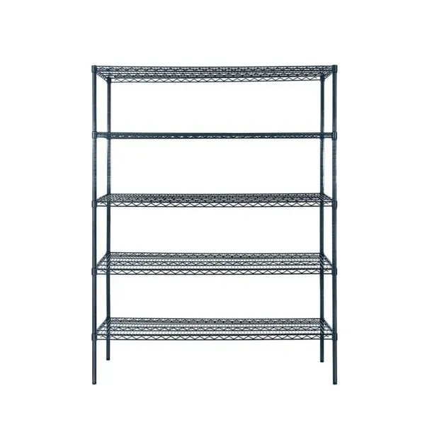 The Slate Grey Epoxy Coated Shelving Kit includes both 4-shelf and 5-shelf configurations, providing flexibility to meet your storage needs. Each kit comes with double locking sleeves and four sturdy posts, available in 74” and 86” heights, ensuring stability and security for your stored items. The shelves are available in depths of 18” and 24” and widths of 24”, 36”, 48”, 60”, and 72”, allowing you to customize your storage space to fit any kitchen layout.
