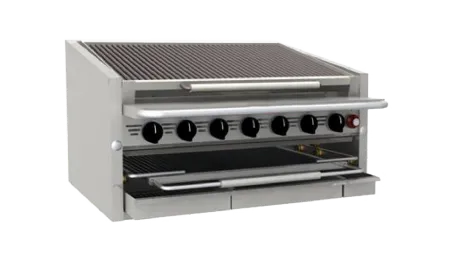 The Bakers Pride C-R Dante Series Countertop Gas Charbroiler features two independently controlled burners that provide precise heat management. Its stainless-steel construction ensures long-lasting durability. Equipped with many options to suit your needs, such as a natural woodsmoke essence box or Glo-Stones for enhanced flavors, delivering consistent, even heat across the cooking surface.