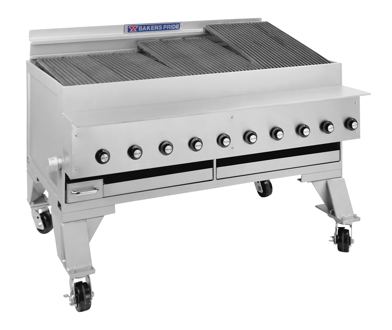 The Bakers Pride® model CH-10 charbroiler is the perfect choice for high-volume broiling. It is constructed of extra heavy-duty plate steel for durability, and each of the ten burners has an output of 18,000 BTUH for energy efficiency yet high production. This model features cast-iron top grates, but you can also select other grate types such as floating rods and meat grates at no extra charge. Grates may be adjusted in three separate titling positions for increased flexibility and temperature control. Heavy-duty, stainless steel radiants come standard or can be substituted for cast iron. For even more versatility, choose from a wide variety of options, such as Glo-Stones and log holders for added flavor or casters for mobility. This charbroiler can also be built in with stone, brick, or masonry for exhibition kitchens.