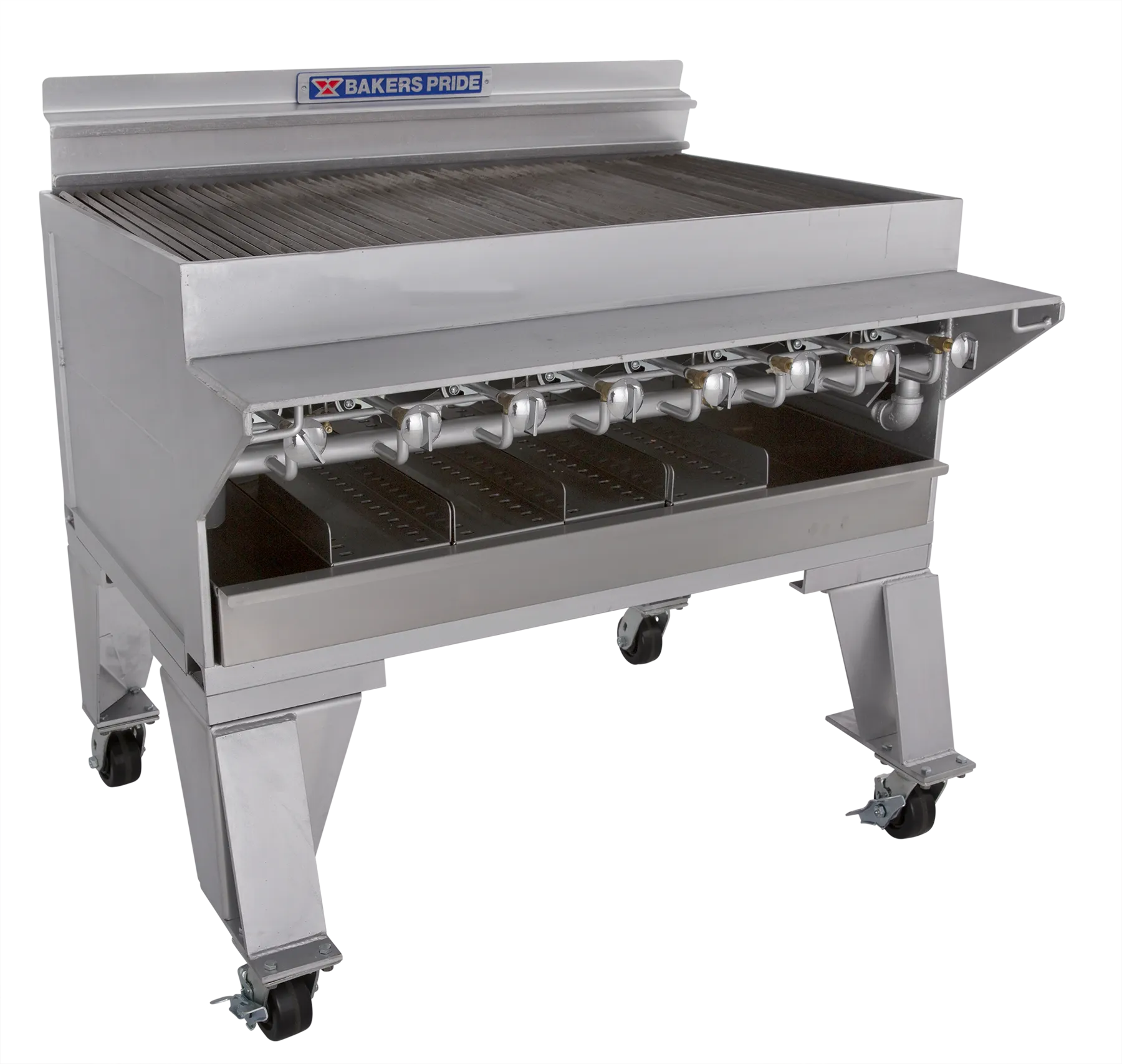 The Bakers Pride® model CH-8 charbroiler is the perfect choice for high-volume broiling. It is constructed of extra heavy-duty plate steel for durability, and each of the eight burners has an output of 18,000 BTUH for energy efficiency yet high production. This model features cast-iron top grates, but you can also select other grate types such as floating rods and meat grates at no extra charge. Grates may be adjusted in three separate titling positions for increased flexibility and temperature control. Heavy-duty, stainless steel radiants come standard or can be substituted for cast iron. For even more versatility, choose from a wide variety of options, such as Glo-Stones and log holders for added flavor or casters for mobility. This charbroiler can also be built in with stone, brick, or masonry for exhibition kitchens.