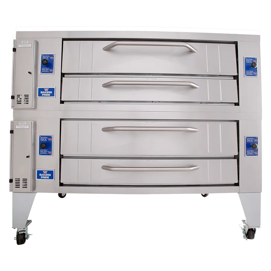 The Bakers Pride® model Y-602 extra-wide gas pizza oven is perfect for high-volume pizza and all-purpose baking operations. This double-stacked model is constructed with heavy-duty, .25" angle iron frame, which is fully welded to allow for stacking. Each oven chamber features a Lightstone fibrament deck with 8" deck height and independently controlled top and bottom heat dampers for perfectly balanced results. The oven exterior is all heavy-duty, stainless steel and fully insulated for cooler outer temperatures and consistent interior temperatures.