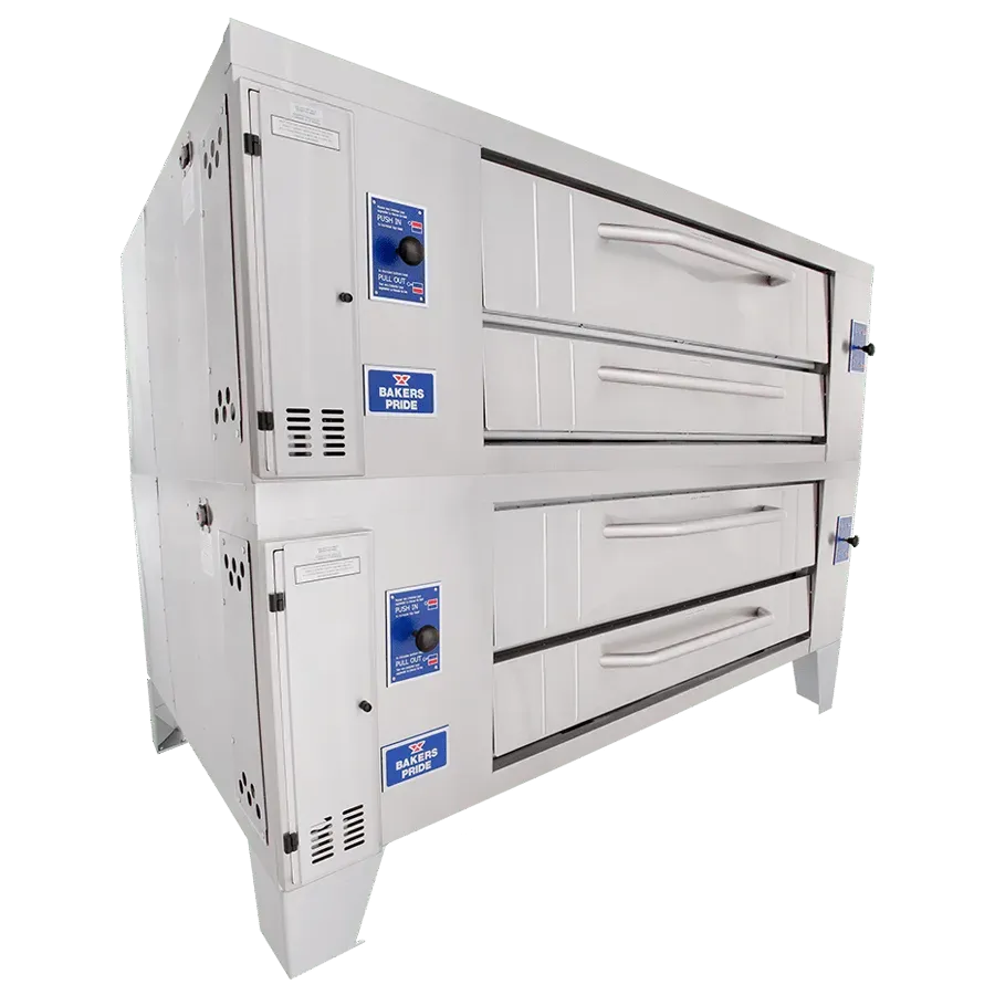 The Bakers Pride® model Y-802 extra-wide gas pizza oven is perfect for high-volume pizza and all-purpose baking operations. This double-stacked model is constructed with heavy-duty, .25" angle iron frame, which is fully welded to allow for stacking. Each oven chamber features a Lightstone fibrament deck with 8" deck height and independently controlled top and bottom heat dampers for perfectly balanced results. The oven exterior is all heavy-duty, stainless steel and fully insulated for cooler outer temperatures and consistent interior temperatures.