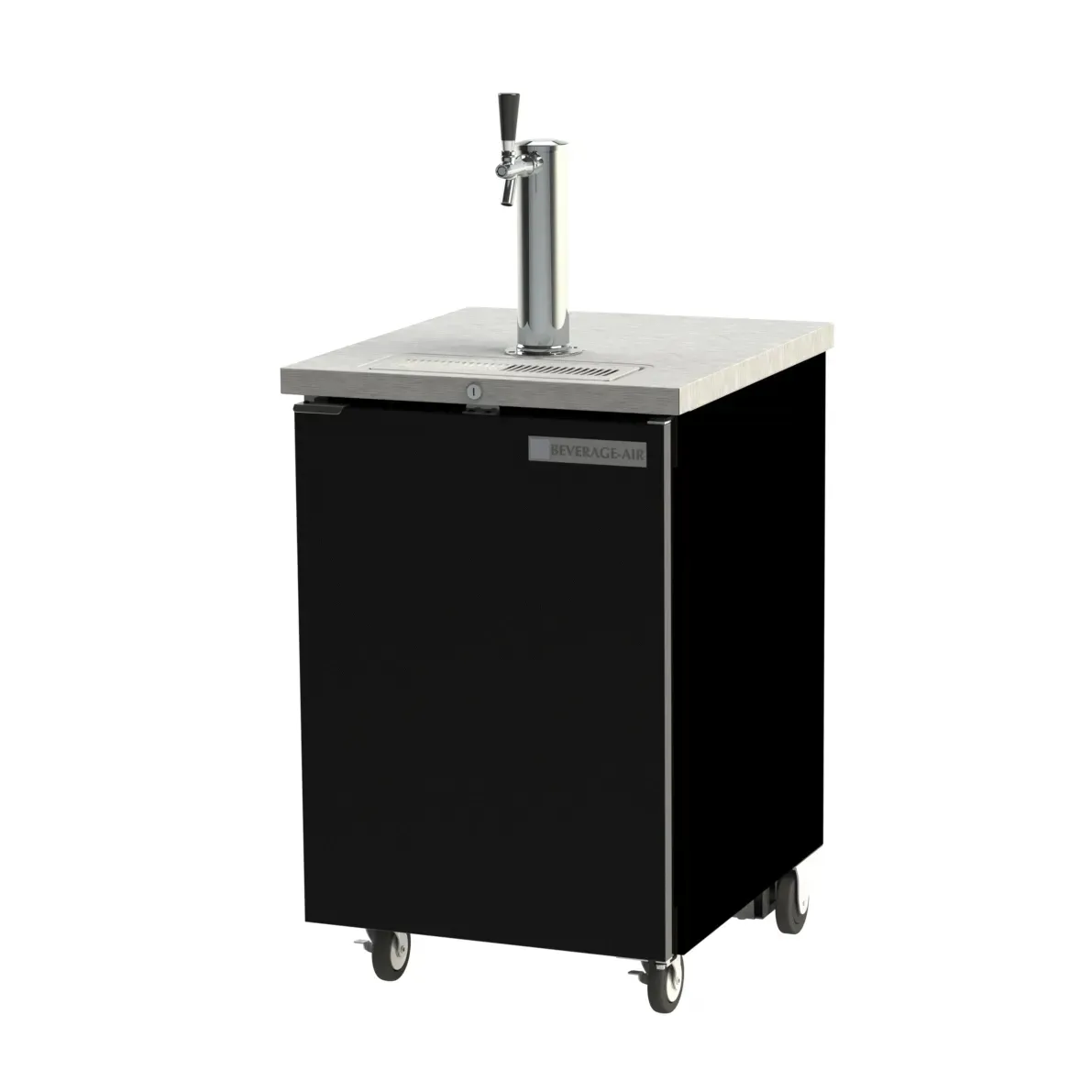 Cook with confidence with the Beverage Air, DD24HC-1-B Draft Beer Cooler. This commercial-grade cooler is designed to meet the needs of busy restaurants, ensuring that your draft beer is always served at the perfect temperature. With a capacity for one keg, this cooler is perfect for small to medium-sized establishments. The black exterior and stainless steel top give it a sleek and professional look that will fit seamlessly into any restaurant decor. The galvanized interior with a reinforced stainless steel floor ensures durability and easy cleaning. Equipped with a self-contained refrigeration system and R290 Hydrocarbon refrigerant, this cooler is energy-efficient and environmentally friendly. The door locks provide added security, while the one single faucet column allows for easy dispensing. Made in the USA and certified by cULus, UL EPH Classified, and UL-Sanitation, you can trust the quality and reliability of this Beverage Air Draft Beer Cooler. Upgrade your restaurant's beverage service with this top-of-the-line cooler.