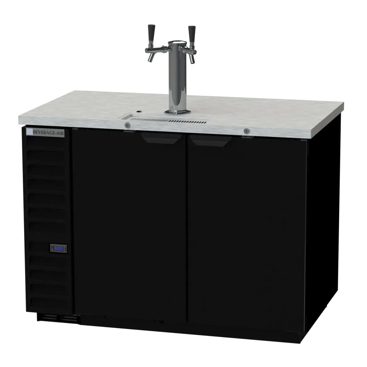 Ignite culinary passion with the Beverage Air DD50HC-1-B Draft Beer Cooler. This top-of-the-line cooler is a must-have for any commercial restaurant looking to serve the perfect draft beer. With its sleek black exterior and stainless steel top, it not only looks great but also ensures durability and longevity. The galvanized interior with a reinforced stainless steel floor provides a hygienic and easy-to-clean space for storing up to two kegs. The self-contained refrigeration system, powered by a 1/4 HP compressor, keeps your beer at the perfect temperature, while the R290 Hydrocarbon refrigerant ensures energy efficiency. The dual faucet column allows for easy pouring, and the door locks provide added security. Proudly made in the USA, this Beverage Air Draft Beer Cooler is cULus and UL-Sanitation certified, guaranteeing its quality and safety. Elevate your beer service with this reliable and efficient cooler.