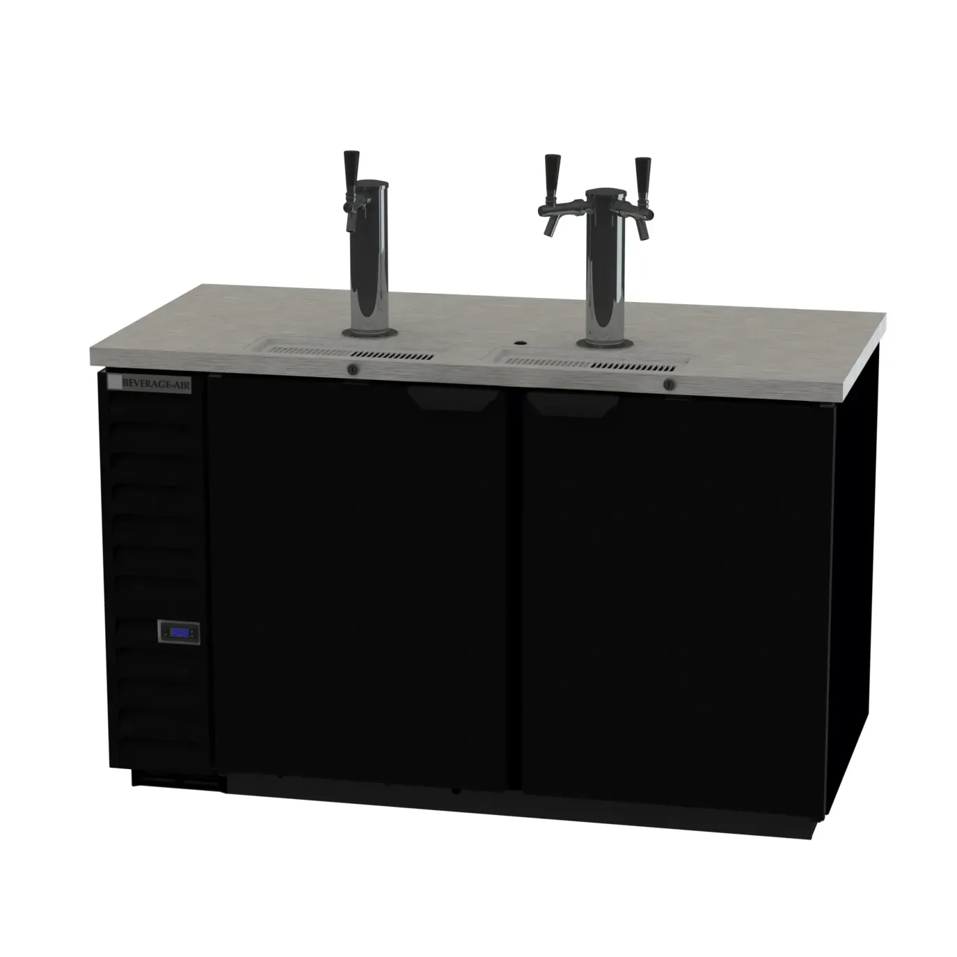 Enhance your commercial kitchen with the Beverage Air DD58HC-1-B Draft Beer Cooler. This top-of-the-line cooler is designed to meet the needs of busy restaurants and bars, providing a reliable and efficient solution for storing and serving draft beer. With its spacious 21.86 cu. ft. capacity and three keg capacity, you'll have plenty of room to keep your customers' favorite brews chilled and ready to pour. The black exterior and stainless steel top give this cooler a sleek and professional look, while the galvanized interior with a reinforced stainless steel floor ensures durability and easy cleaning. The self-contained refrigeration system uses R290 Hydrocarbon refrigerant, making it environmentally friendly and energy-efficient. Equipped with door locks and a single and dual faucet tower, this draft beer cooler offers convenience and security. Trust Beverage Air, a reputable brand known for its quality and reliability, and elevate your beverage service with the DD58HC-1-B Draft Beer Cooler.