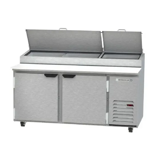 Transform your food service with the Beverage Air DP67HC Refrigerated Counter, Pizza Prep Table. This two-section, 67"W table is designed to meet the demands of a busy commercial restaurant. With a spacious 20.7 cu. ft. capacity, it offers ample storage for your ingredients and supplies. The table features two doors and four shelves, allowing for easy organization and access to your items. The stainless steel top comes with a refrigerated pan rail, perfect for keeping your pizza toppings fresh and ready for use. Additionally, the 19" cutting board provides a convenient workspace for food preparation. The DP67HC is equipped with side-mounted self-contained refrigeration, ensuring efficient cooling and temperature control. Made in the USA and certified by cULus, UL EPH Classified, and UL-Sanitation, this prep table is a reliable and durable choice for any commercial kitchen. Upgrade your restaurant's efficiency and productivity with the Beverage Air DP67HC Refrigerated Counter, Pizza Prep Table.
