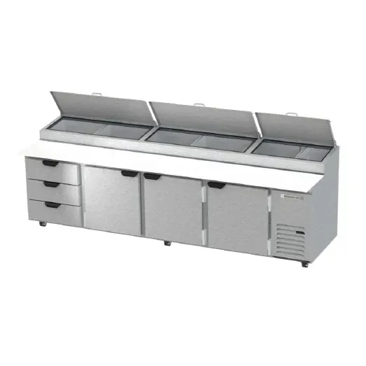 Realize kitchen dreams with the Beverage Air DPD119HC-3 Refrigerated Counter, Pizza Prep Table. This four-section unit is designed to meet the demands of a busy commercial restaurant. With a spacious 119" width and 42.2 cu. ft. capacity, it offers ample storage for all your ingredients and supplies. The unit features three drawers and three doors, along with six shelves for organized storage. The stainless steel top comes with a refrigerated pan rail, perfect for keeping your pizza toppings fresh and easily accessible. The 19" cutting board provides a convenient workspace for food preparation. Made in the USA, this unit is built to last with a durable stainless steel front, sides, and top, and an aluminum interior. The side-mounted self-contained refrigeration system ensures efficient cooling, while the R290 Hydrocarbon refrigerant is environmentally friendly. With its UL EPH Classified and UL-Sanitation certifications, this Beverage Air Refrigerated Counter is a reliable and safe choice for any commercial kitchen.