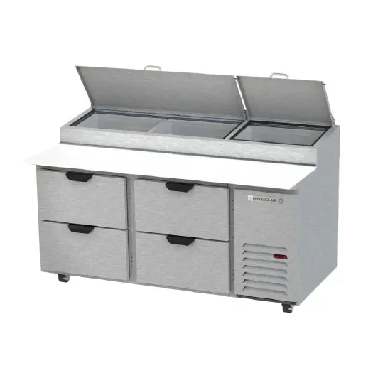 Empower your kitchen staff with the Beverage Air DPD67HC-4 Refrigerated Counter, Pizza Prep Table. This two-section unit is designed to streamline your pizza preparation process, making it perfect for commercial restaurant use. With a spacious 67" width and 20.7 cu. ft. capacity, it offers ample storage for all your ingredients. The unit features four drawers and a stainless steel top with a refrigerated pan rail, allowing you to keep your toppings fresh and easily accessible. It also includes a 19" cutting board for convenient food preparation. Made in the USA with a stainless steel front, sides, and top, as well as an aluminum interior, this prep table is built to withstand the demands of a busy kitchen. The side-mounted self-contained refrigeration system uses R290 Hydrocarbon refrigerant, ensuring efficient cooling while minimizing environmental impact. Trust Beverage Air for reliable, high-quality equipment that will enhance your restaurant's efficiency and productivity.