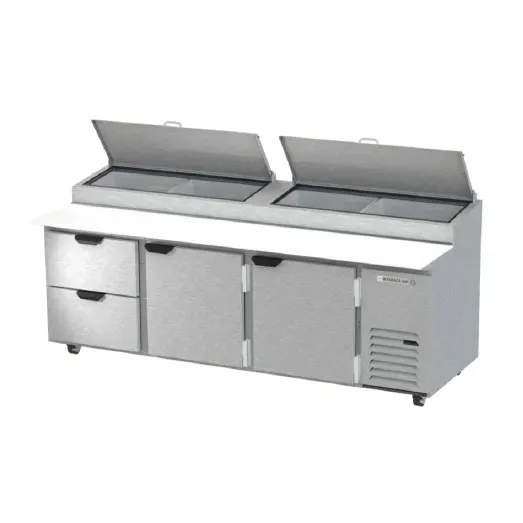 Introducing the Beverage Air DPD93HC-2 Refrigerated Counter, Pizza Prep Table - the perfect solution to simplify restaurant operations. This three-section pizza top refrigerated counter offers a spacious 93"W design, providing ample storage and preparation space for your commercial kitchen. With a generous 31.5 cu. ft. capacity, this unit features two drawers and two doors, along with four shelves and a four full-size pan top capacity. The stainless steel top comes with a refrigerated pan rail and a convenient 19" cutting board, allowing for efficient pizza preparation. Made in the USA, this unit is built to last with a durable stainless steel front, sides, and top, as well as an aluminum interior. The side-mounted self-contained refrigeration system ensures optimal cooling performance, while the R290 Hydrocarbon refrigerant promotes energy efficiency. With its cULus and UL-Sanitation certifications, this Beverage Air Refrigerated Counter is a reliable and safe choice for any commercial restaurant.