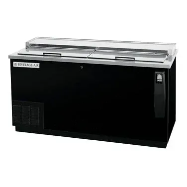 Create culinary magic with the Beverage Air, DW64HC-B-29 Bottle Cooler. This frosty brew bottle cooler is designed to meet the needs of commercial restaurants, providing ample space and efficient cooling capabilities. With dimensions of 65"W x 26-1/2"D x 33-3/4"H and a capacity of 18.5 cu. ft., this cooler can hold up to 25-1/4 cases of 12 oz. bottles or 34-3/4 cases of 12 oz. cans. The deep well design and adjustable dividers allow for easy organization and customization of the interior space. The cooler features two sliding lids, a bottle cap opener, and a cap catcher for added convenience. Its black vinyl exterior and galvanized interior ensure durability, while the stainless steel top adds a touch of elegance. With self-contained refrigeration and a 1/4 HP compressor, this cooler keeps your beverages below 32 F, ensuring they are always refreshingly cold. Trust in the quality and reliability of Beverage Air, a trusted name in the industry.