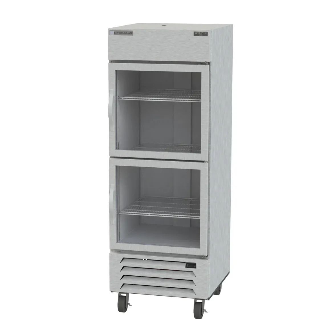Elevate your culinary experience with the Beverage Air HBR27HC-1-HG Refrigerator, Reach-In. This Horizon Series refrigerator is designed to meet the demands of a commercial restaurant, offering a spacious 25.88 cu. ft. capacity to store all your perishable ingredients. The two right-hand hinged glass half doors provide easy access and allow you to showcase your products to customers. With three adjustable shelves, you can customize the interior layout to accommodate items of various sizes. The electronic control and digital display make it easy to monitor and adjust the temperature, ensuring your food stays fresh and safe. The LED interior lighting illuminates the contents, making it easy to find what you need. Made in the USA with a stainless steel interior and exterior, this refrigerator is not only durable but also easy to clean. The bottom-mounted self-contained refrigeration system and R290 Hydrocarbon refrigerant ensure efficient cooling while being environmentally friendly. Trust Beverage Air, a reputable vendor in the industry, and invest in this reliable and high-quality reach-in refrigerator for your commercial kitchen.