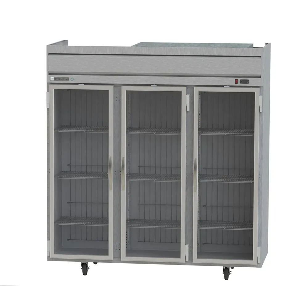 Introducing the Beverage Air HR3HC-1G Refrigerator, Reach-In - the perfect solution for delivering food perfection in your commercial restaurant. With its Horizon Series design, this three-section refrigerator offers a spacious 71.52 cu. ft. capacity, ensuring ample storage space for all your ingredients and prepared dishes. The unit features three glass doors, with the center and right doors hinged on the right and the left door hinged on the left, allowing for easy access and efficient workflow. Equipped with electronic control and LED interior lighting, this refrigerator provides precise temperature management and excellent visibility of your stored items. The stainless steel front and gray painted sides not only enhance the unit's durability but also add a sleek and professional look to your kitchen. With top-mounted self-contained refrigeration and R290 Hydrocarbon refrigerant, this refrigerator ensures energy efficiency and eco-friendliness. Trust in the Beverage Air HR3HC-1G to elevate your restaurant's efficiency and food quality.