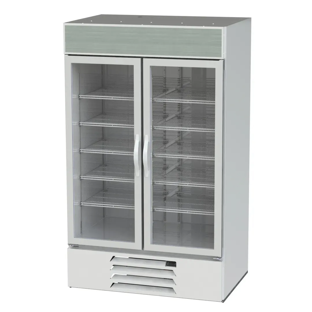 Ignite culinary passion with the Beverage Air MMR44HC-1-W Refrigerator Merchandiser. This two-section reach-in unit is designed to meet the needs of commercial restaurants, offering a spacious 40.2 cu. ft. capacity to store and display a wide variety of food and beverages. The two double pane hinged glass doors provide a clear view of the contents, while the LED interior lighting enhances visibility and presentation. With 10 epoxy coated steel shelves, you can organize your products efficiently and maximize storage space. The self-closing doors with automatic hold-open feature ensure convenience and energy efficiency. The anti-microbial door handles promote hygiene and cleanliness. The bottom-mounted refrigeration system and R290 Hydrocarbon refrigerant ensure optimal cooling performance while reducing energy consumption. Made in the USA and certified by cULus, UL EPH Classified, and UL-Sanitation, this Beverage Air Refrigerator Merchandiser is a reliable and high-quality addition to any commercial kitchen.