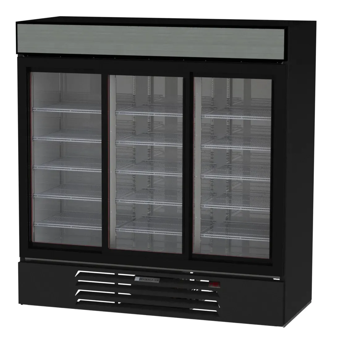 Empower your kitchen staff with the Beverage Air MMR66HC-1-B Refrigerator Merchandiser. This market-max refrigerated merchandiser is perfect for commercial restaurant use. With its three-section design and three black framed sliding glass doors, it offers easy access to a spacious 64.4 cu. ft. capacity. The automatic hold-open feature ensures convenience during busy service hours. The electronic control and digital display allow for precise temperature management, while the auto defrost feature saves time and effort. The 15 epoxy coated steel shelves provide ample storage space for your products, and the LED interior lighting ensures visibility. The lighted sign panel attracts customers' attention, boosting sales. The bottom-mounted refrigeration system is efficient and reliable. Made in the USA, this merchandiser is cULus, UL EPH Classified, and UL-Sanitation certified. With its white interior and black exterior, it adds a sleek and professional touch to any commercial kitchen. Trust Beverage Air for quality and performance.